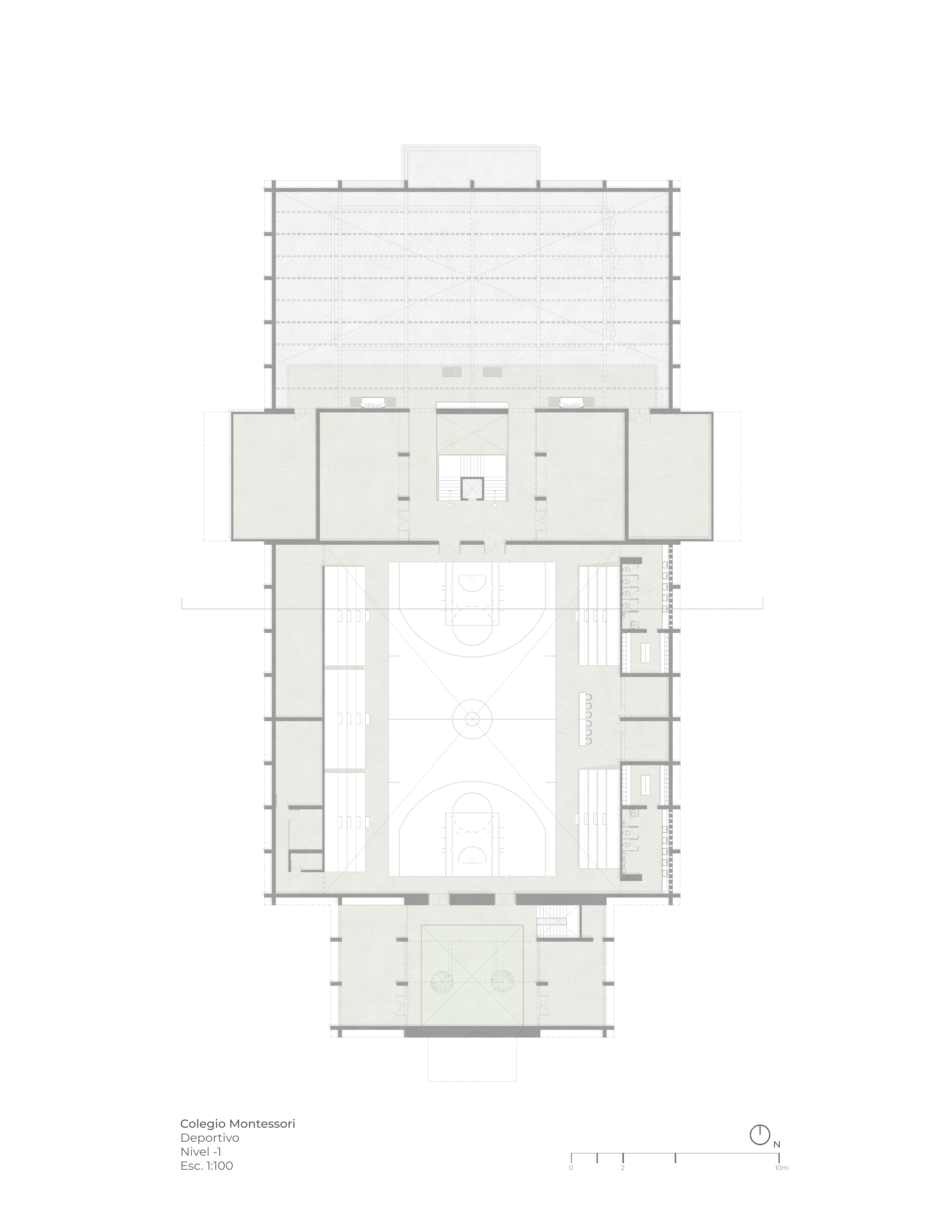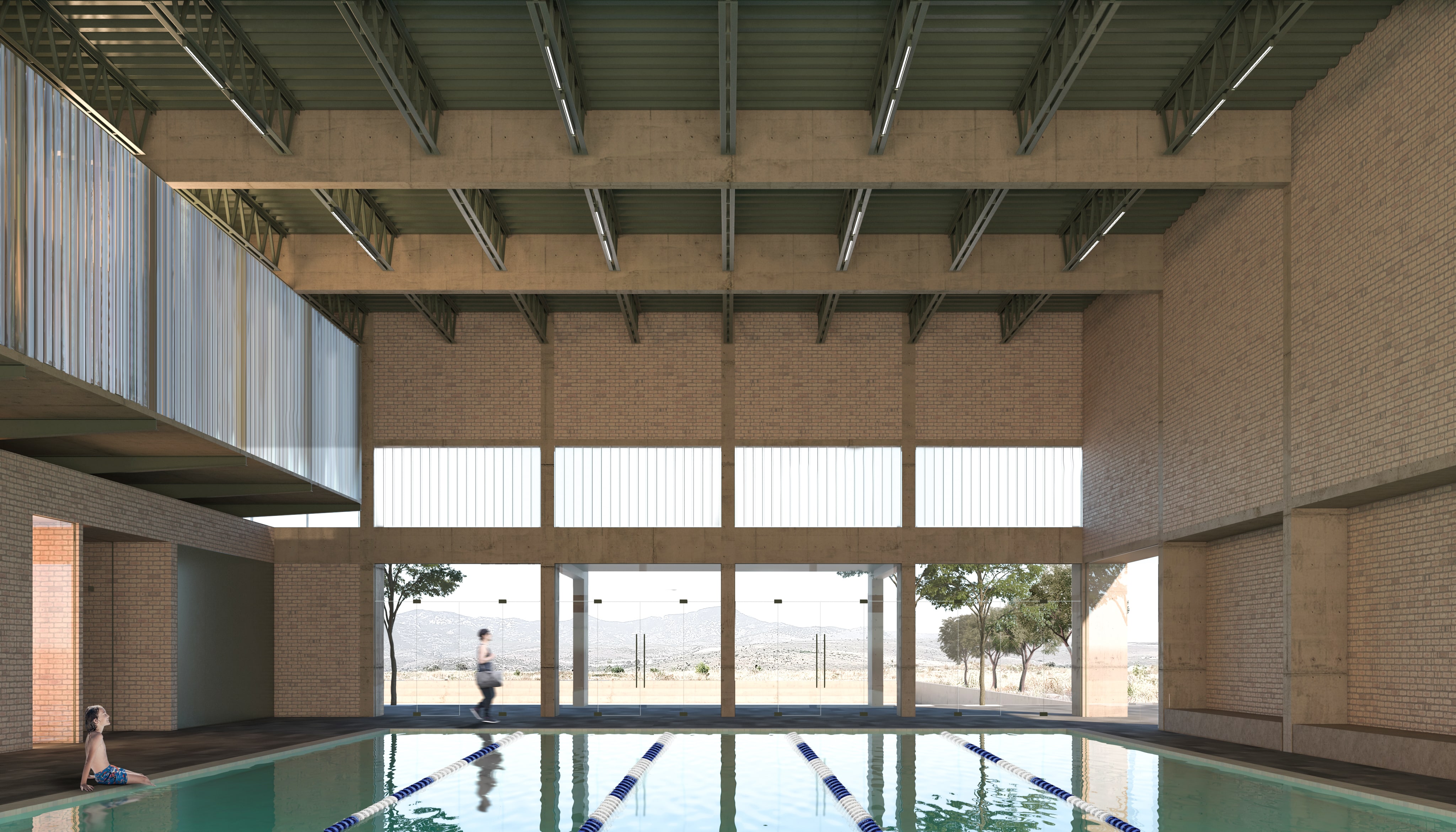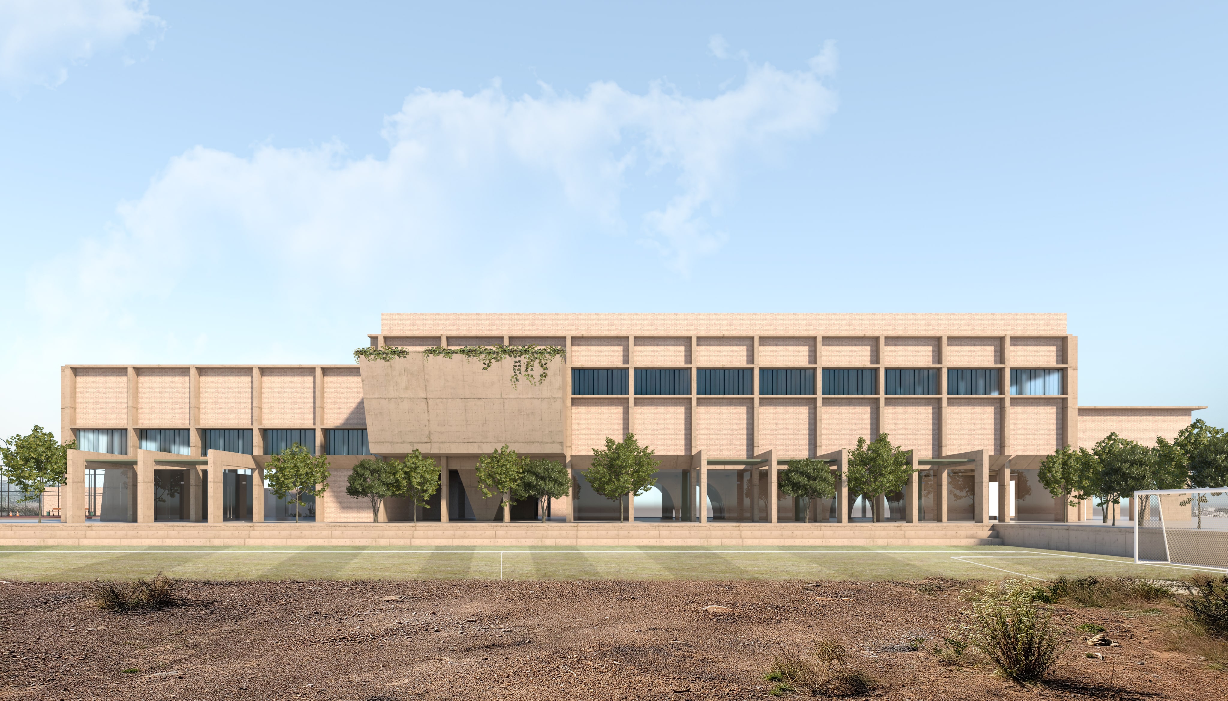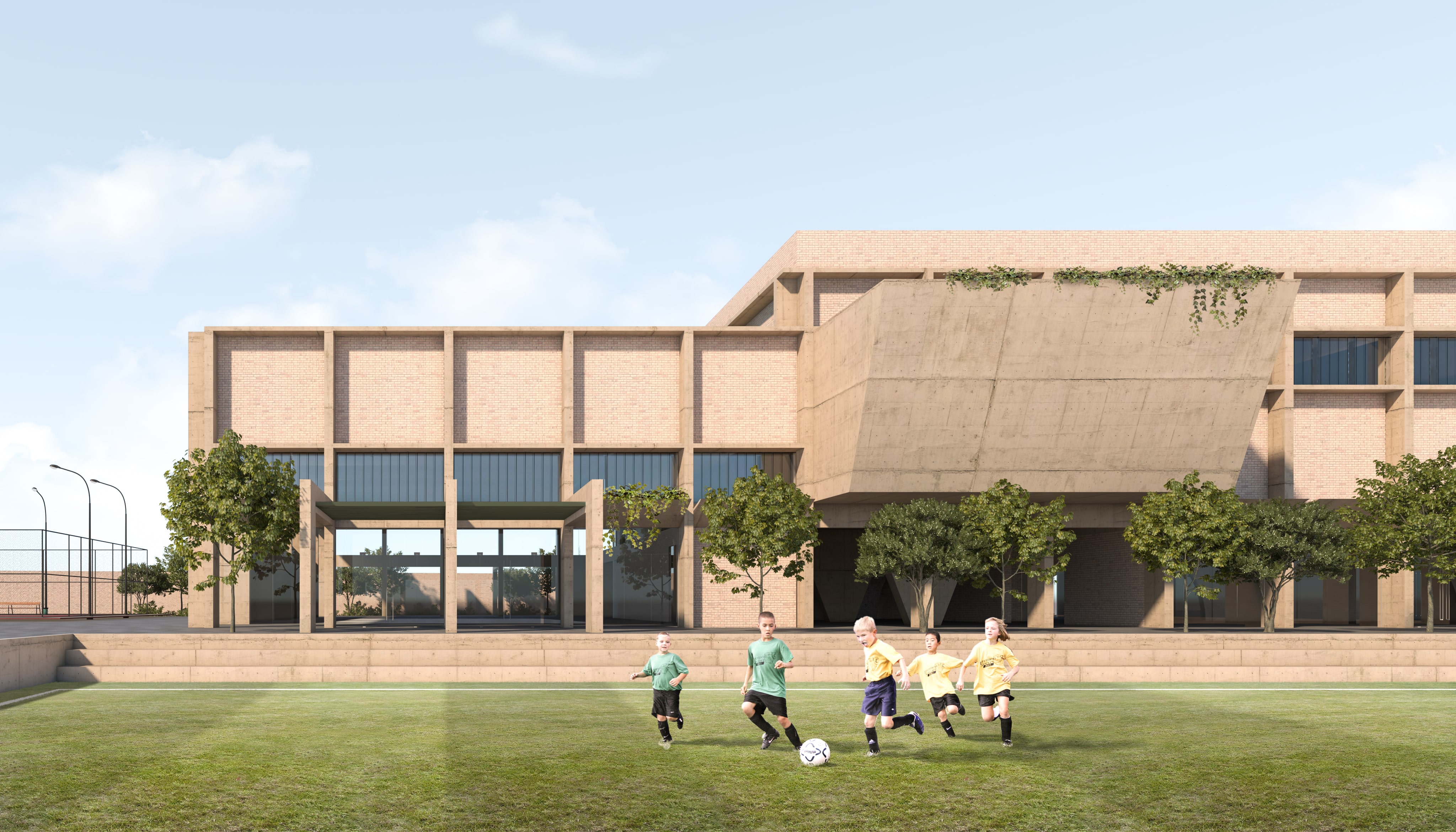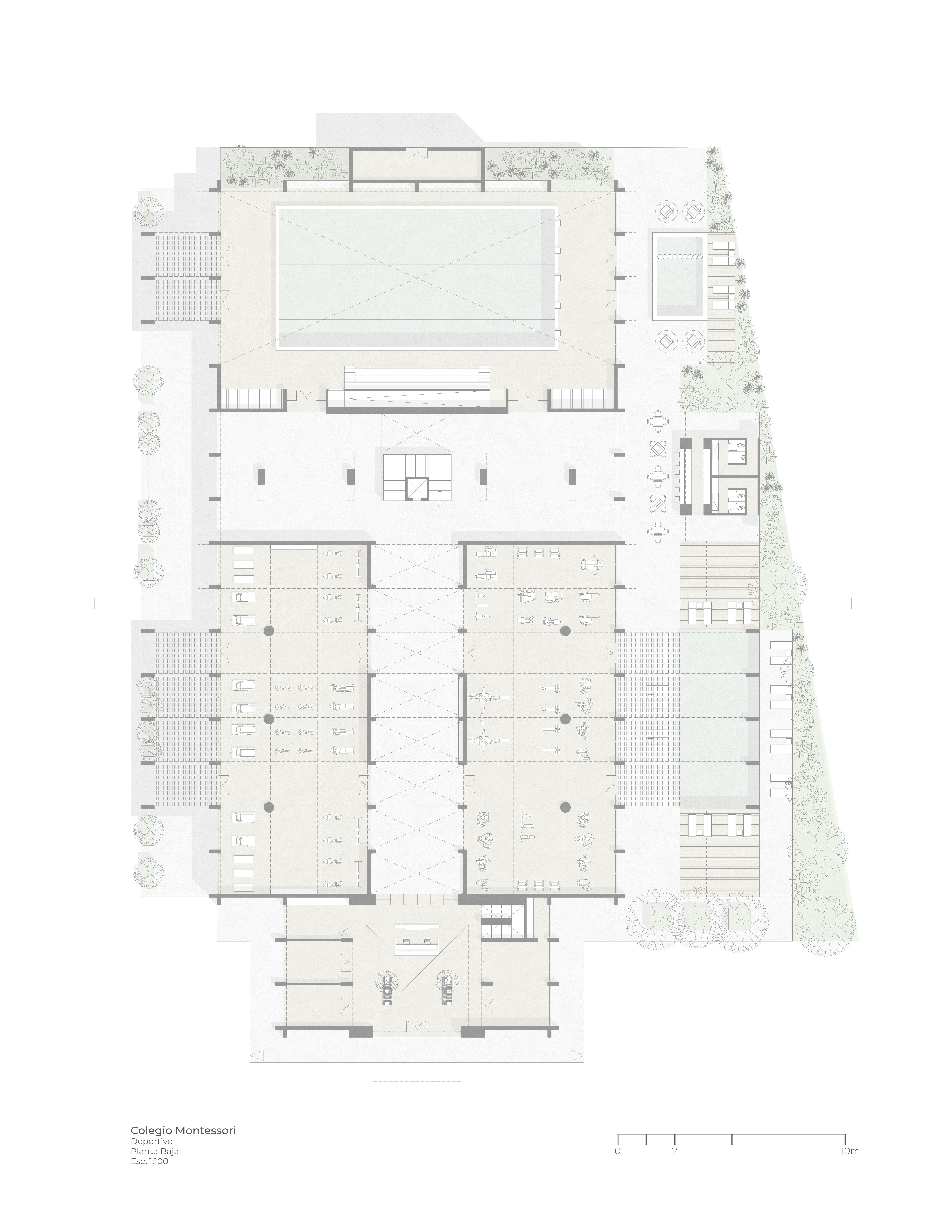 El proyecto de urbanización propone la creación de edificios para una escuela y un club deportivo, separados por un circuito de distribución que fragmenta los predios según el uso de suelo. Un gran jardín y una cancha de Fútbol 7 en el centro crean la ilusión de un parque continuo. La escuela Montessori se diseñó con un enfoque modular y progresivo, permitiendo su construcción por etapas. La retícula de 9x9 metros y pasillos de dos metros entre huellas facilita la expansión y la creación de espacios versátiles. La Biblioteca se ubica al poniente y se conecta con un huerto. La permeabilidad modular refleja la idea de 'Libertad con límites' de Montessori. La materialidad busca integrarse al contexto árido de la región con elementos de concreto, ladrillo beige y terrazo. Para el club deportivo, se busca una presencia contundente con naves basilicales para la alberca y la arena. El edificio sigue el mismo lenguaje material que la escuela, con una estructura modular de concreto aparente. Las áreas abiertas rodean las naves, incluyendo canchas de pádel, tenis, Fútbol 7, alberca social y cafetería. La materialidad incluye concreto aparente, ladrillo beige y terrazo pulido.