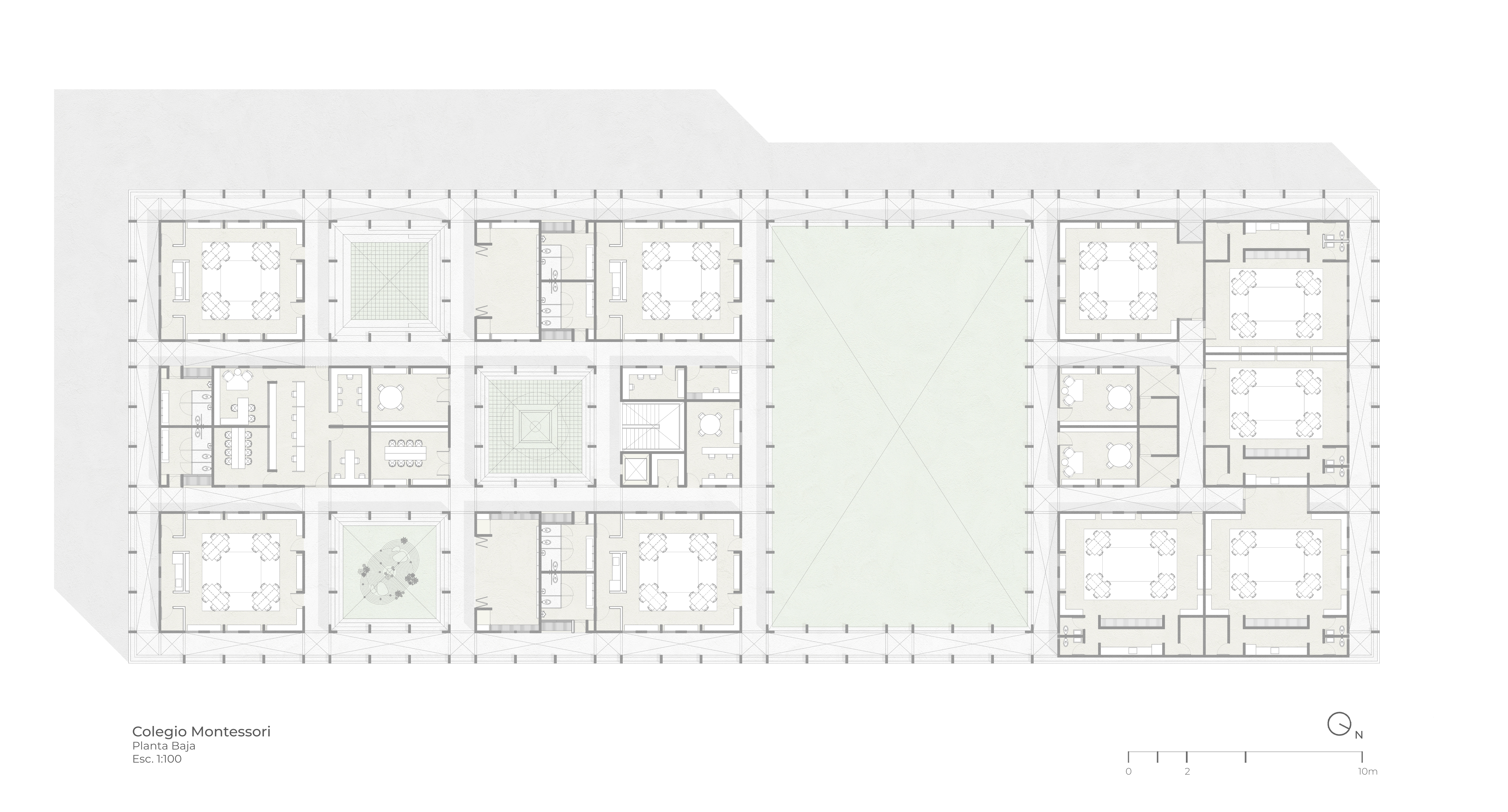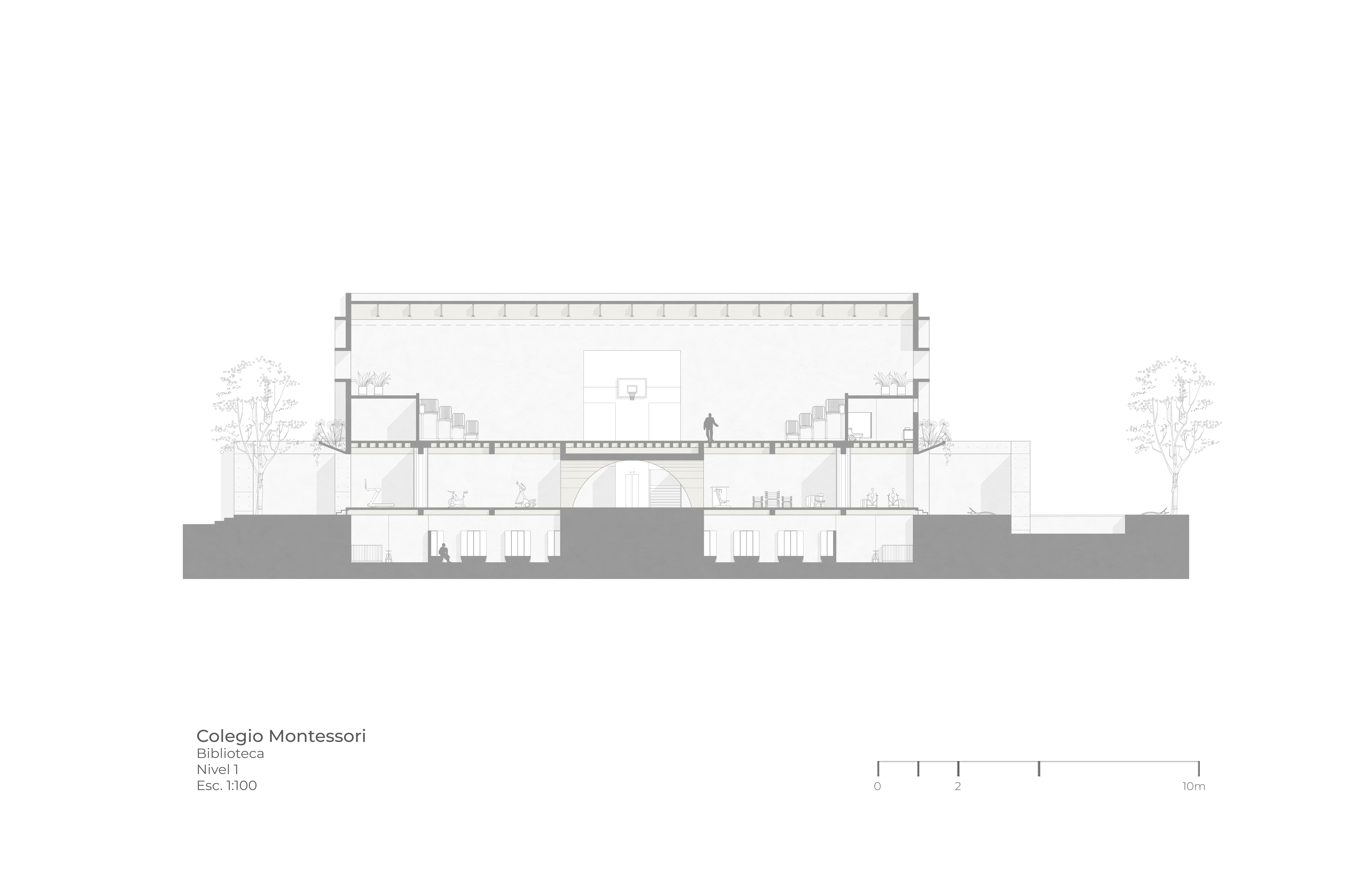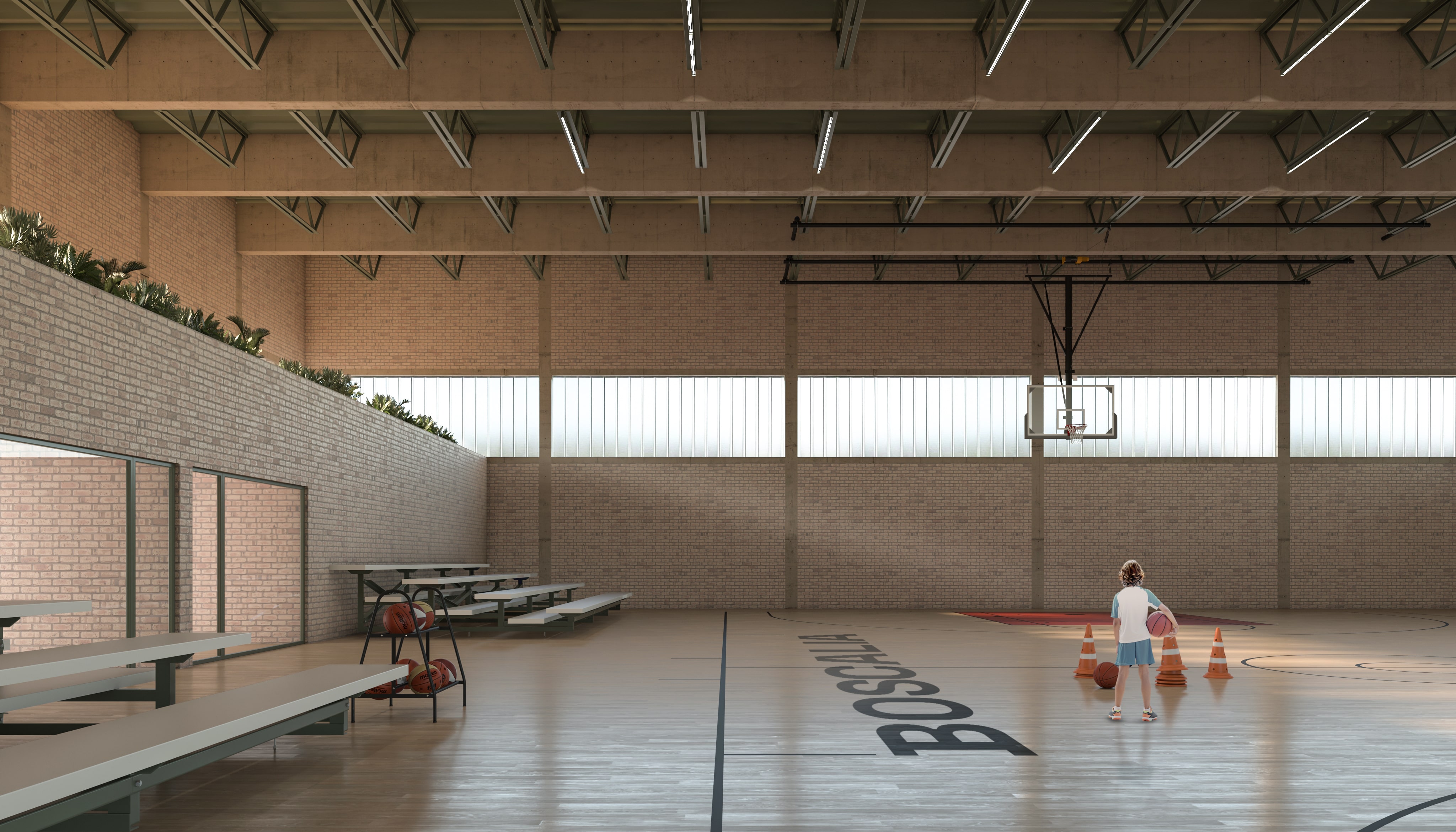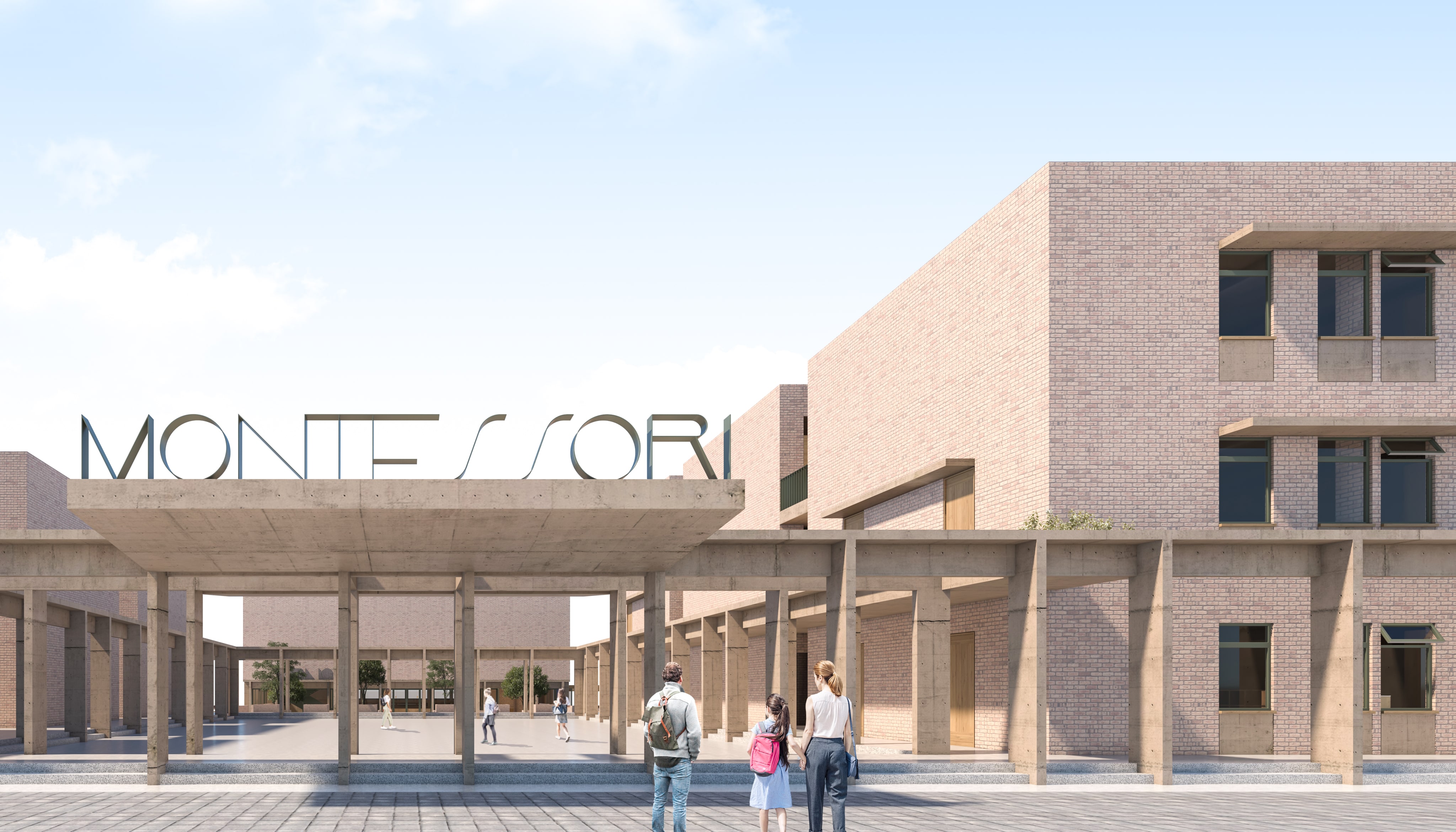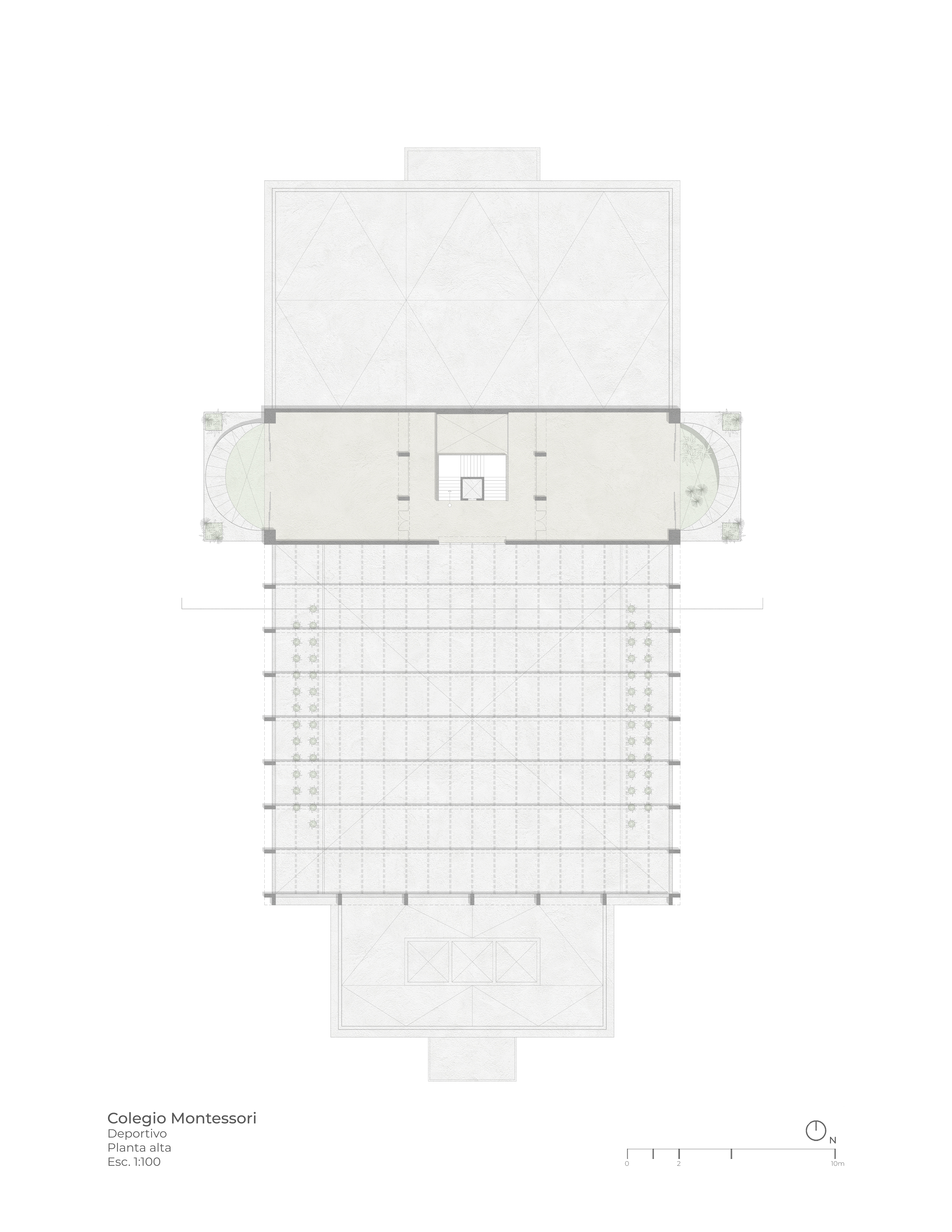 El proyecto de urbanización propone la creación de edificios para una escuela y un club deportivo, separados por un circuito de distribución que fragmenta los predios según el uso de suelo. Un gran jardín y una cancha de Fútbol 7 en el centro crean la ilusión de un parque continuo. La escuela Montessori se diseñó con un enfoque modular y progresivo, permitiendo su construcción por etapas. La retícula de 9x9 metros y pasillos de dos metros entre huellas facilita la expansión y la creación de espacios versátiles. La Biblioteca se ubica al poniente y se conecta con un huerto. La permeabilidad modular refleja la idea de 'Libertad con límites' de Montessori. La materialidad busca integrarse al contexto árido de la región con elementos de concreto, ladrillo beige y terrazo. Para el club deportivo, se busca una presencia contundente con naves basilicales para la alberca y la arena. El edificio sigue el mismo lenguaje material que la escuela, con una estructura modular de concreto aparente. Las áreas abiertas rodean las naves, incluyendo canchas de pádel, tenis, Fútbol 7, alberca social y cafetería. La materialidad incluye concreto aparente, ladrillo beige y terrazo pulido.