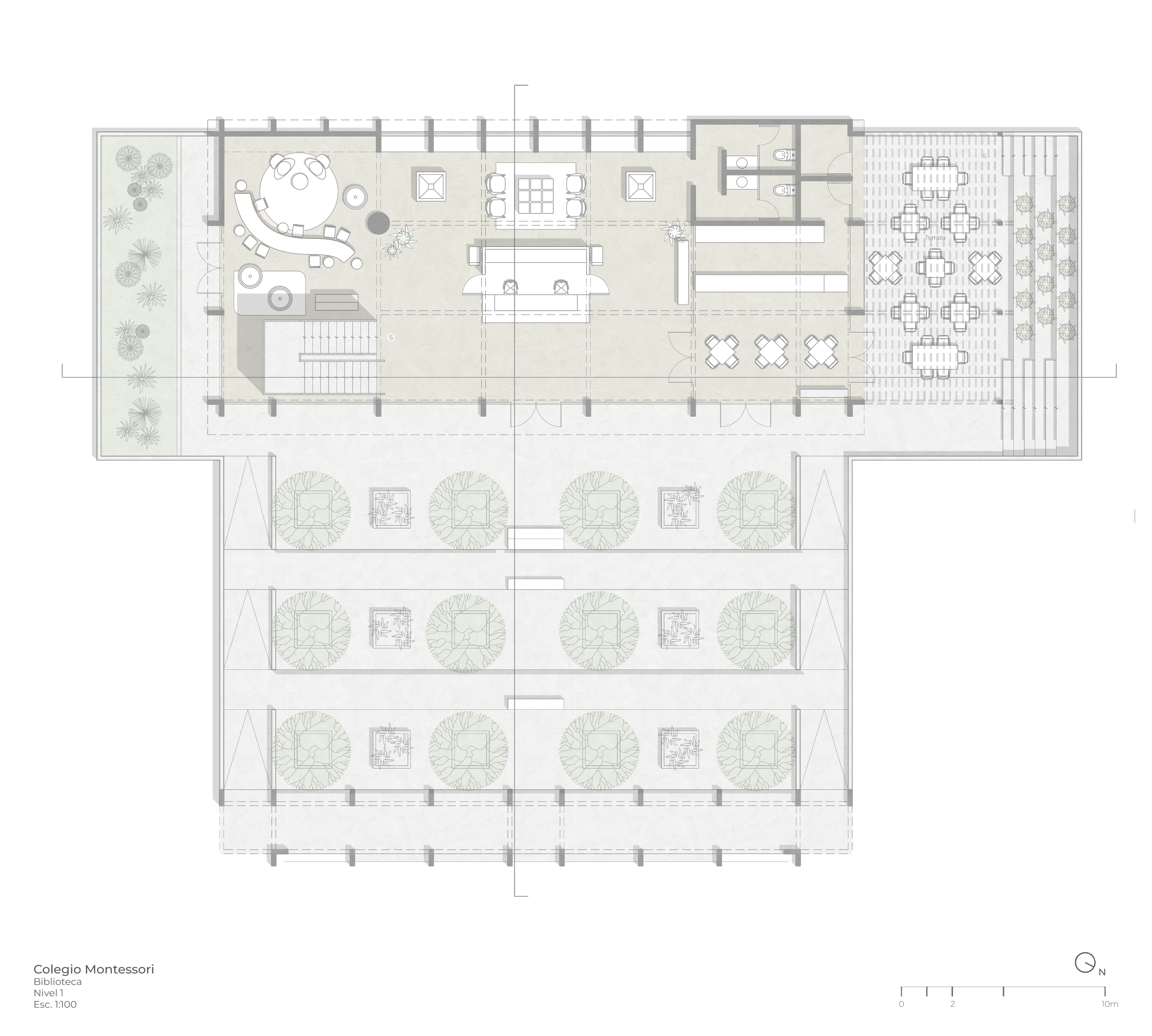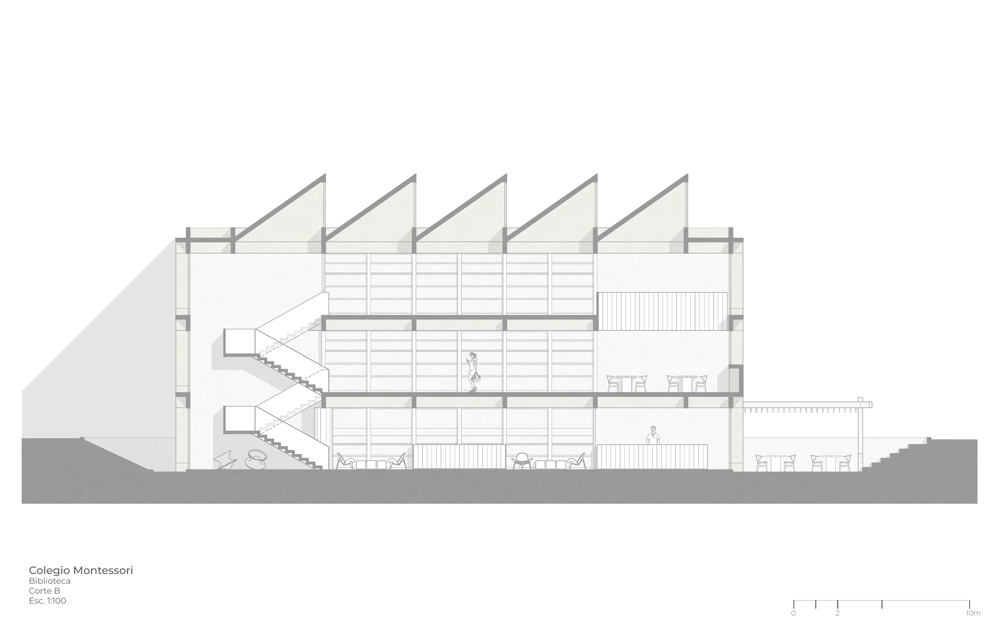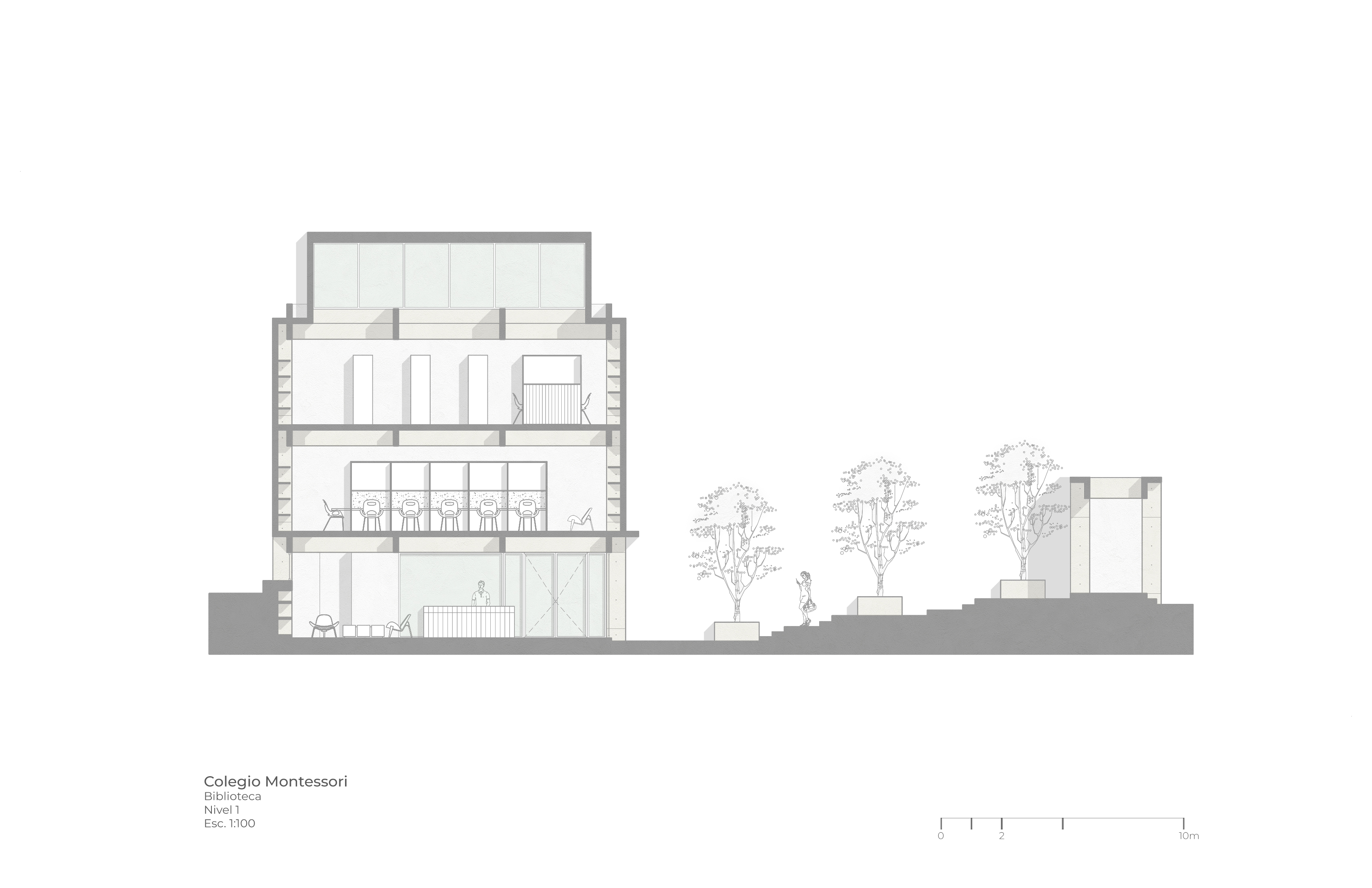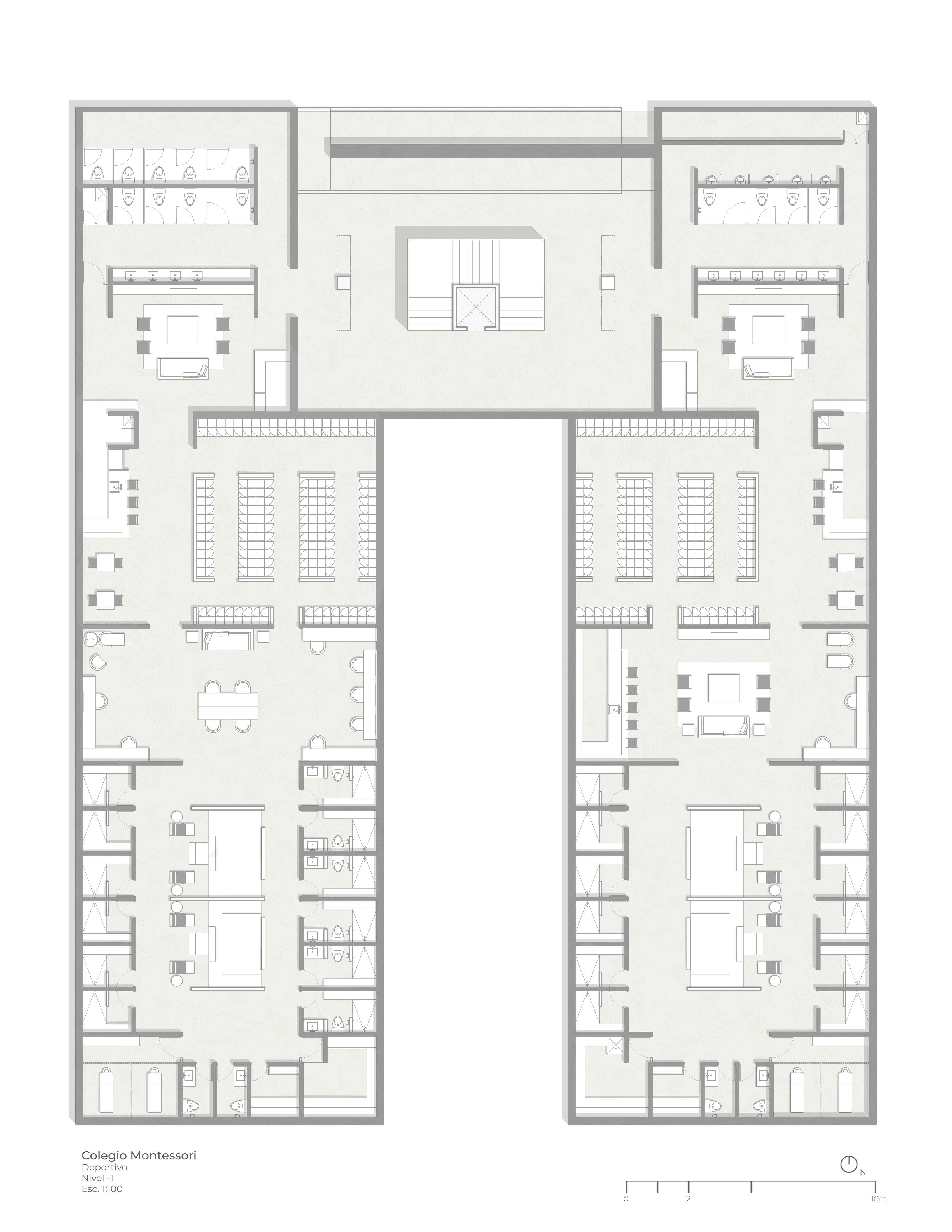 El proyecto de urbanización propone la creación de edificios para una escuela y un club deportivo, separados por un circuito de distribución que fragmenta los predios según el uso de suelo. Un gran jardín y una cancha de Fútbol 7 en el centro crean la ilusión de un parque continuo. La escuela Montessori se diseñó con un enfoque modular y progresivo, permitiendo su construcción por etapas. La retícula de 9x9 metros y pasillos de dos metros entre huellas facilita la expansión y la creación de espacios versátiles. La Biblioteca se ubica al poniente y se conecta con un huerto. La permeabilidad modular refleja la idea de 'Libertad con límites' de Montessori. La materialidad busca integrarse al contexto árido de la región con elementos de concreto, ladrillo beige y terrazo. Para el club deportivo, se busca una presencia contundente con naves basilicales para la alberca y la arena. El edificio sigue el mismo lenguaje material que la escuela, con una estructura modular de concreto aparente. Las áreas abiertas rodean las naves, incluyendo canchas de pádel, tenis, Fútbol 7, alberca social y cafetería. La materialidad incluye concreto aparente, ladrillo beige y terrazo pulido.