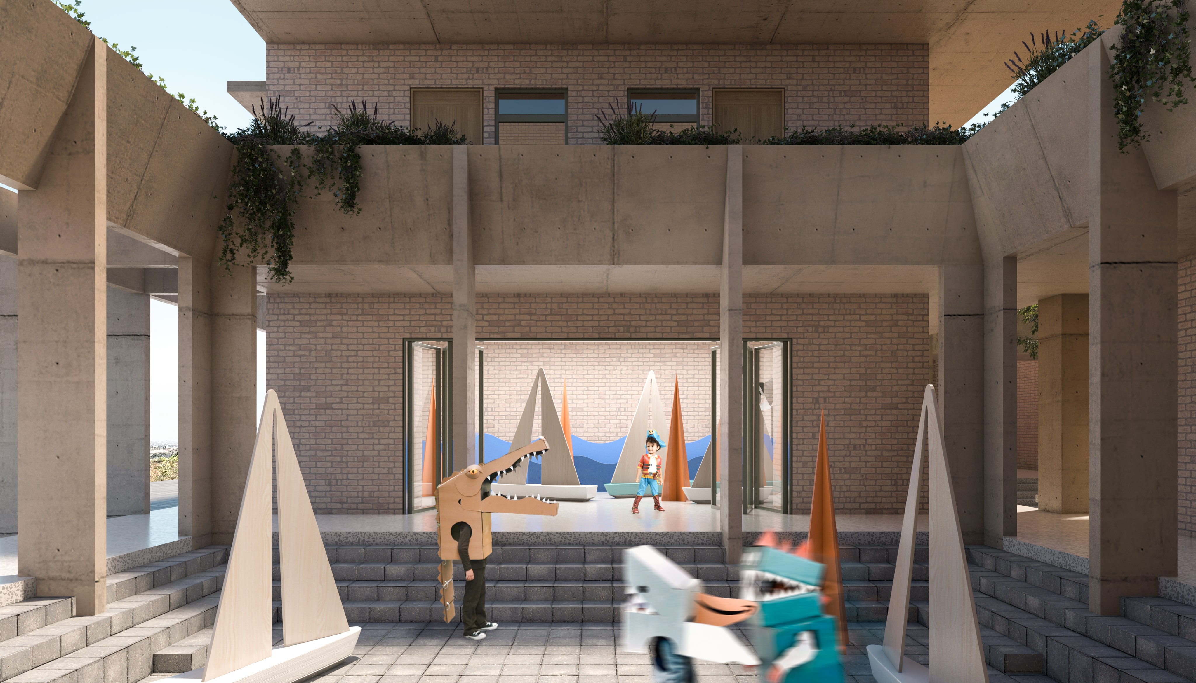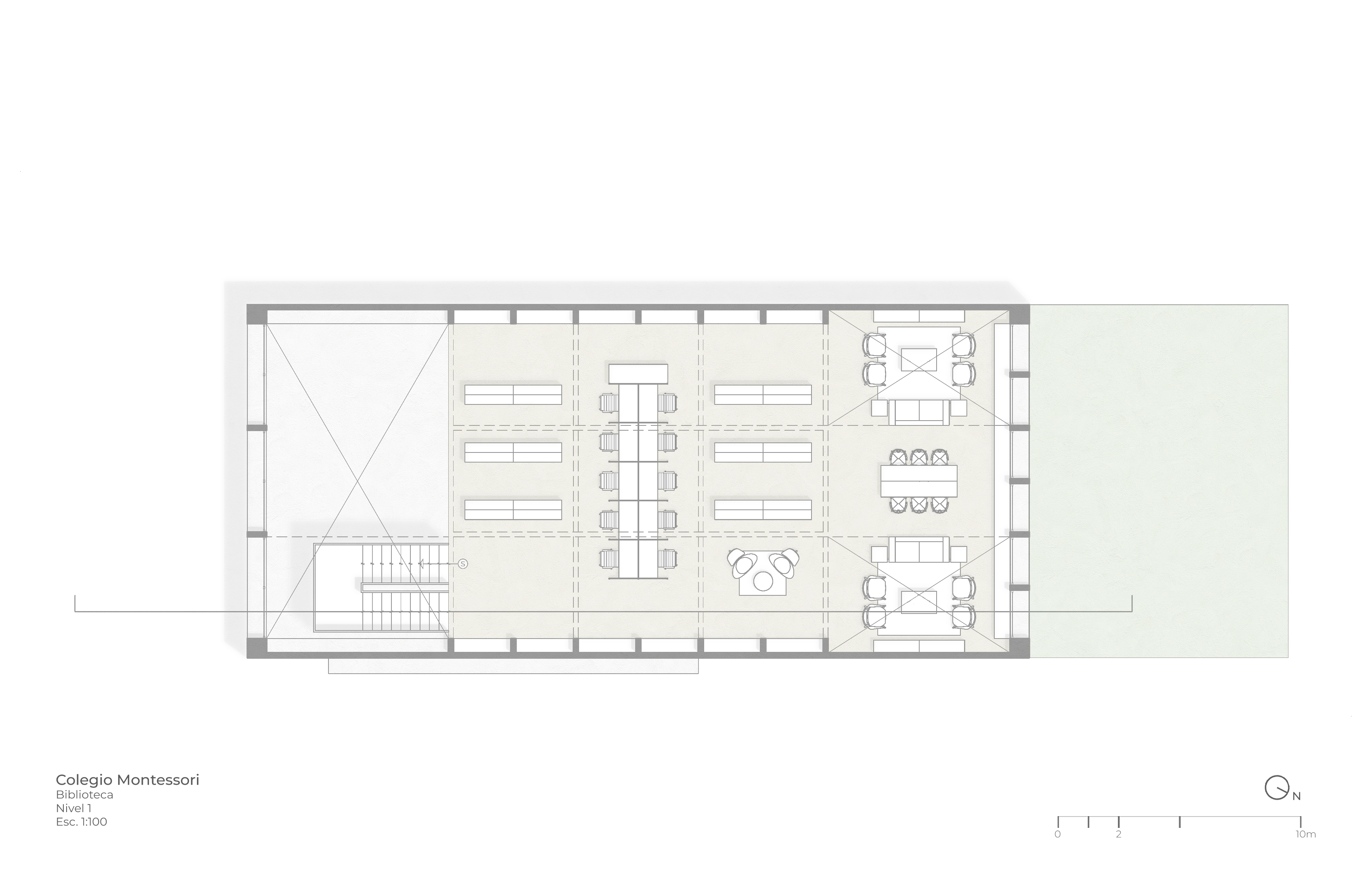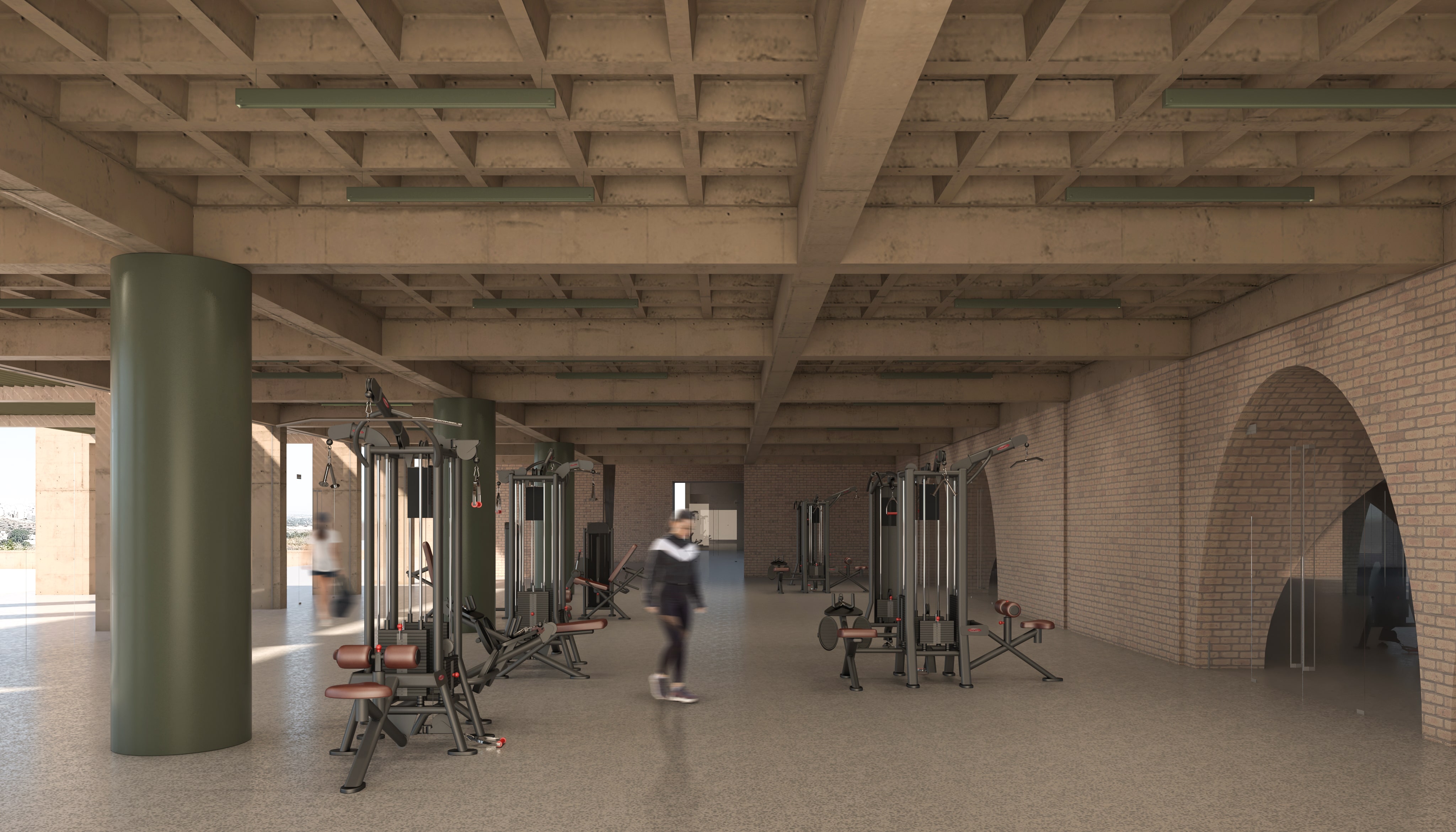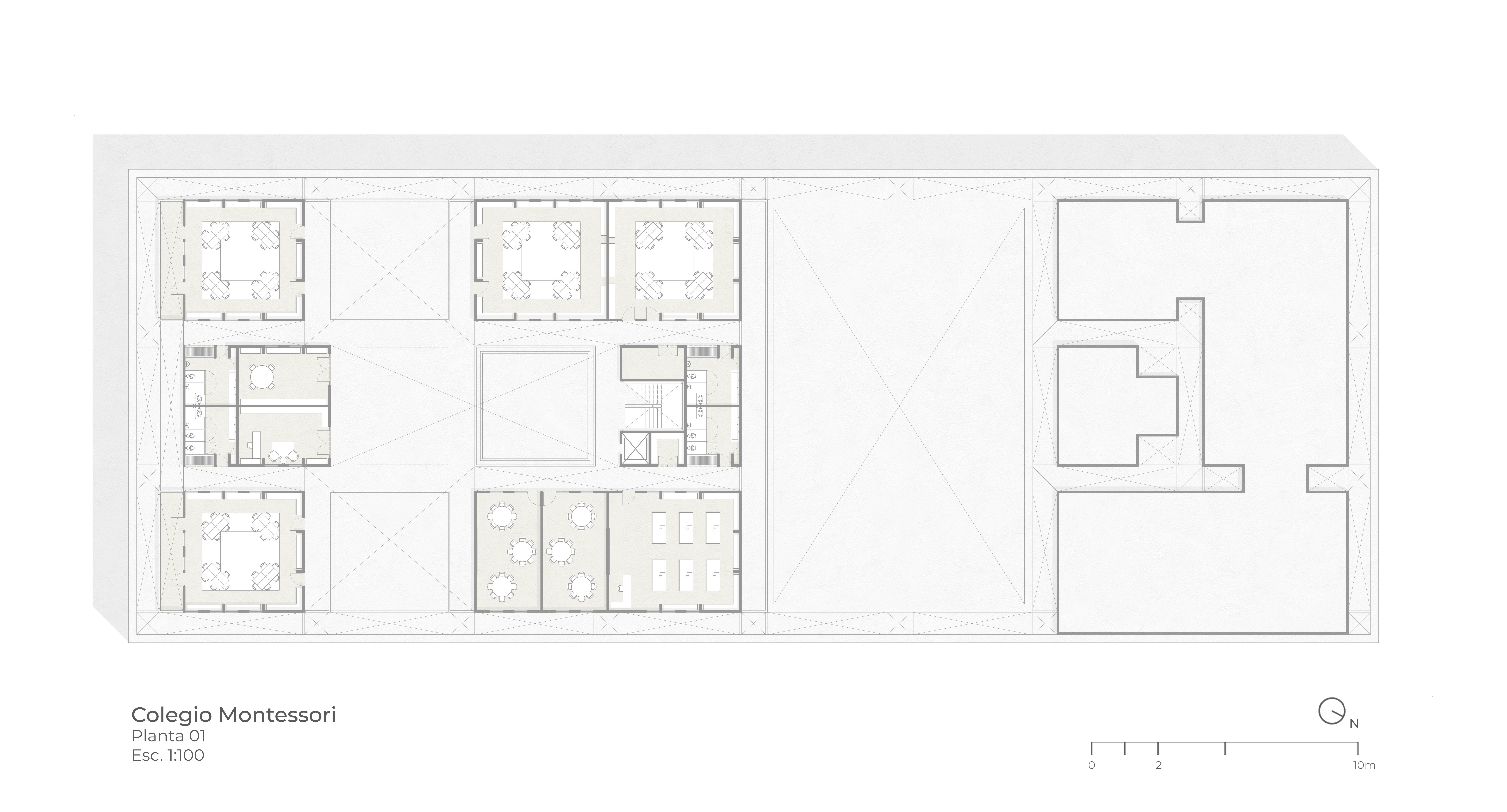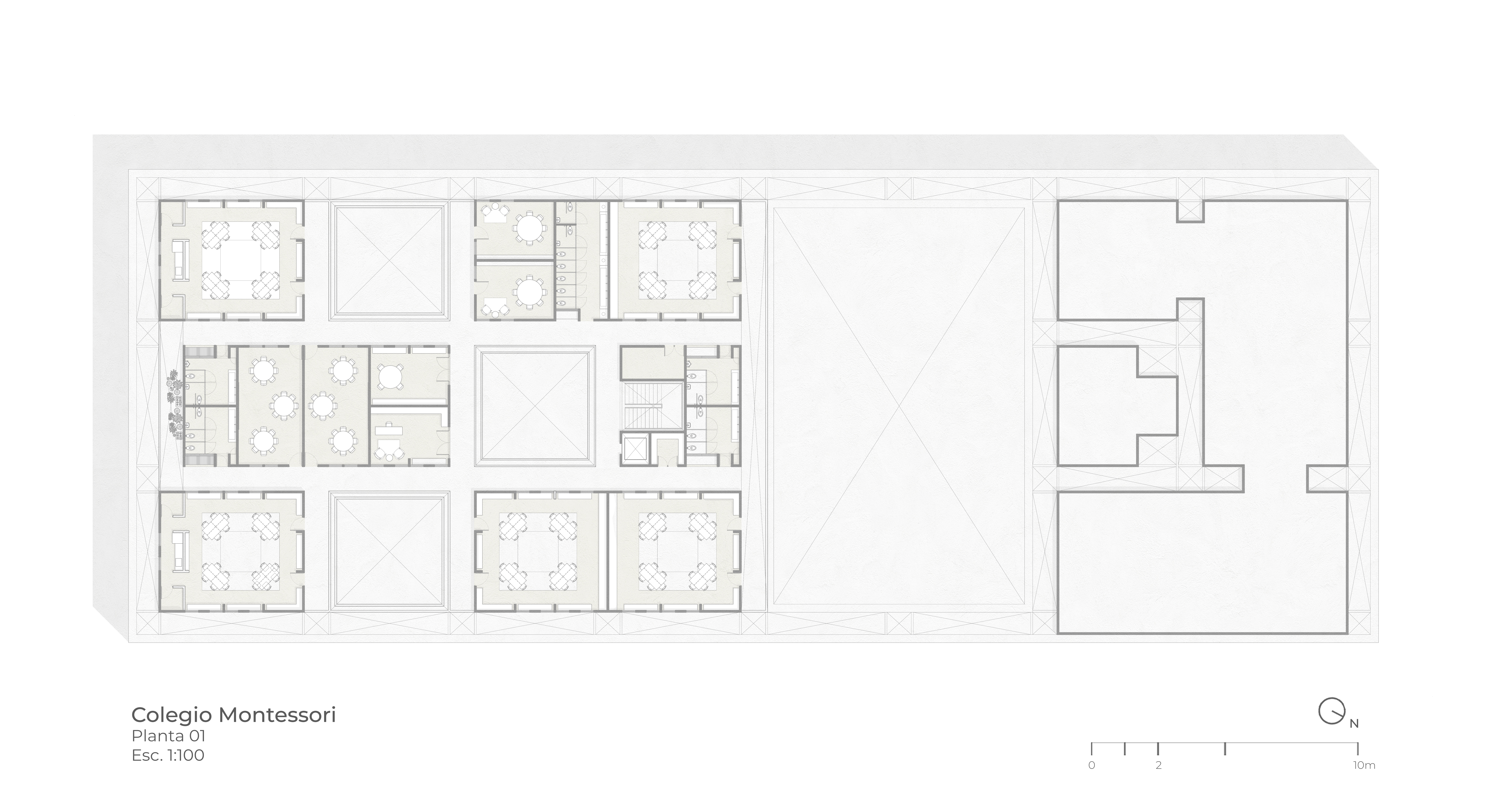 El proyecto de urbanización propone la creación de edificios para una escuela y un club deportivo, separados por un circuito de distribución que fragmenta los predios según el uso de suelo. Un gran jardín y una cancha de Fútbol 7 en el centro crean la ilusión de un parque continuo. La escuela Montessori se diseñó con un enfoque modular y progresivo, permitiendo su construcción por etapas. La retícula de 9x9 metros y pasillos de dos metros entre huellas facilita la expansión y la creación de espacios versátiles. La Biblioteca se ubica al poniente y se conecta con un huerto. La permeabilidad modular refleja la idea de 'Libertad con límites' de Montessori. La materialidad busca integrarse al contexto árido de la región con elementos de concreto, ladrillo beige y terrazo. Para el club deportivo, se busca una presencia contundente con naves basilicales para la alberca y la arena. El edificio sigue el mismo lenguaje material que la escuela, con una estructura modular de concreto aparente. Las áreas abiertas rodean las naves, incluyendo canchas de pádel, tenis, Fútbol 7, alberca social y cafetería. La materialidad incluye concreto aparente, ladrillo beige y terrazo pulido.