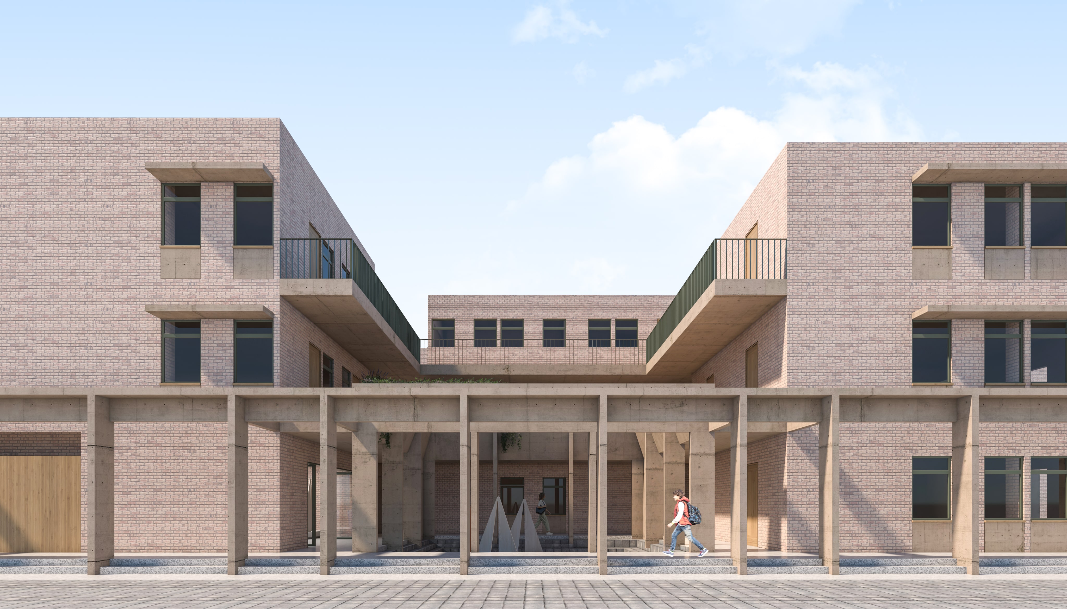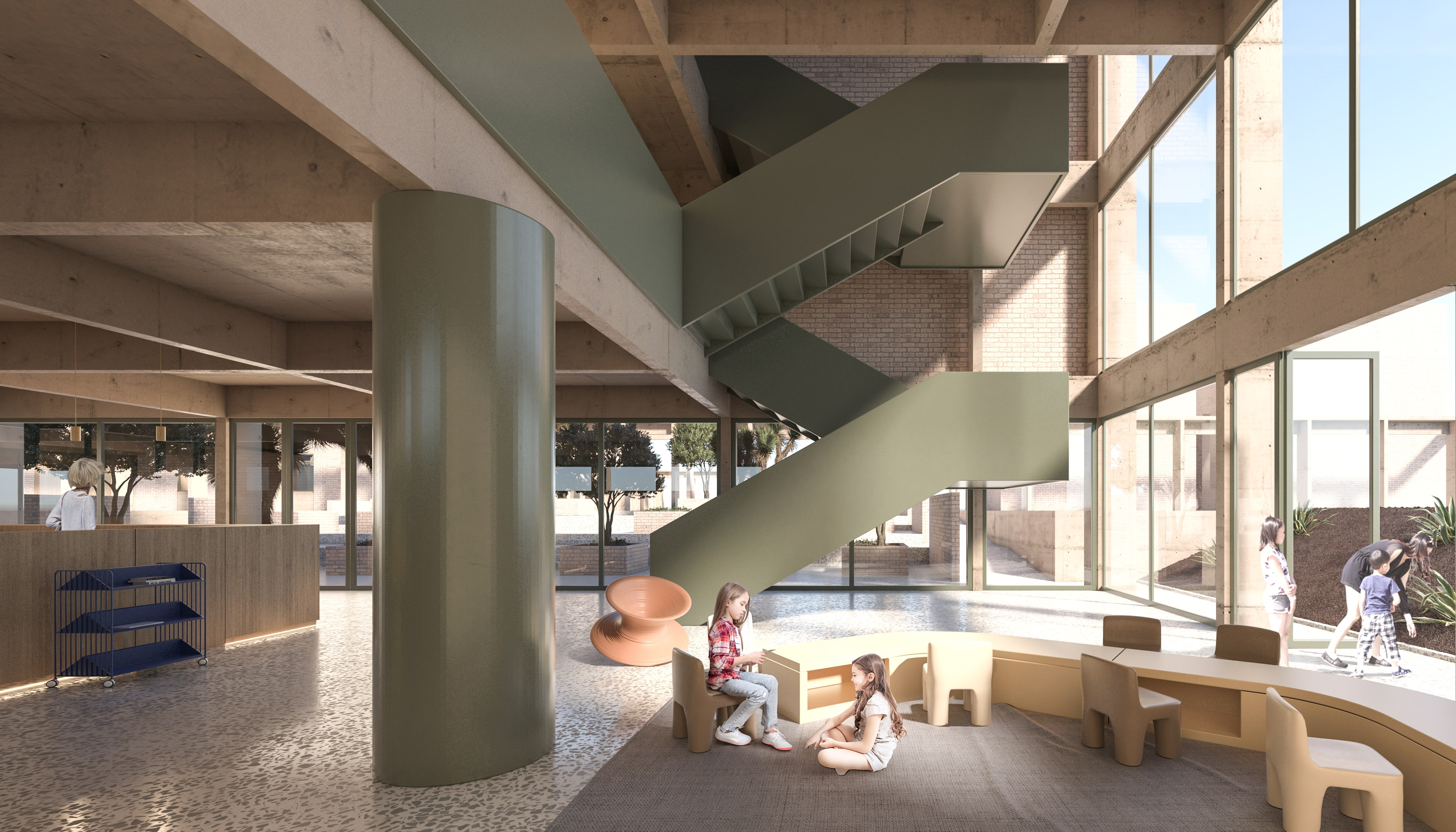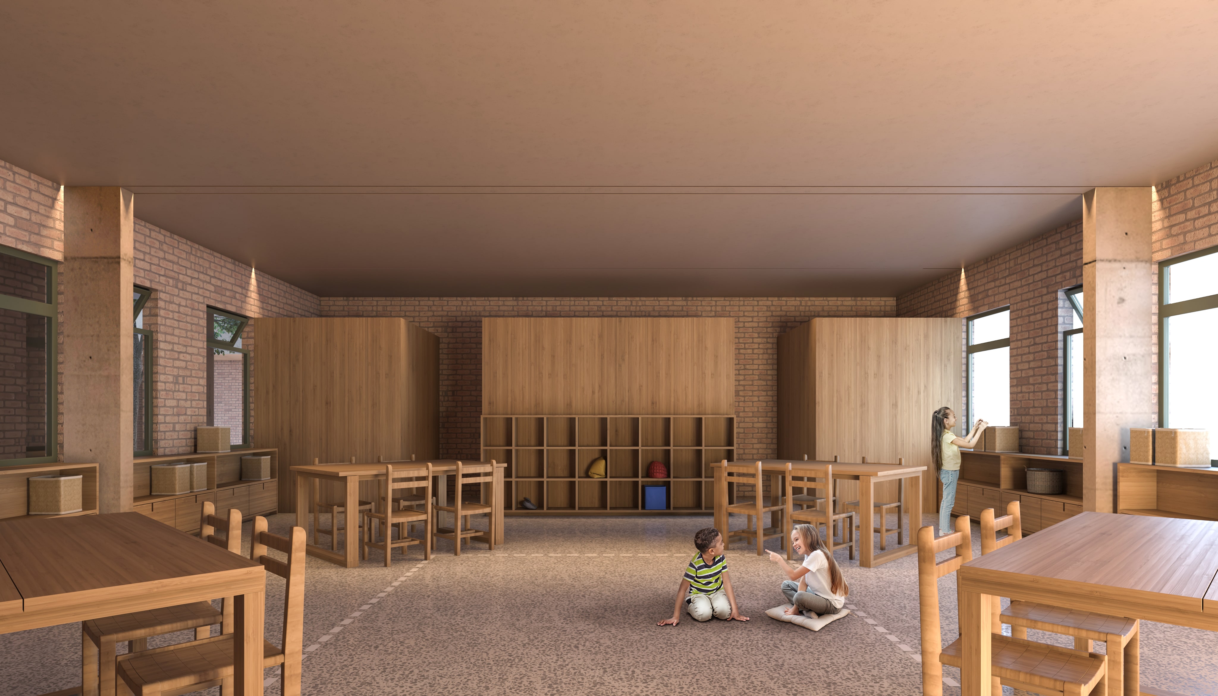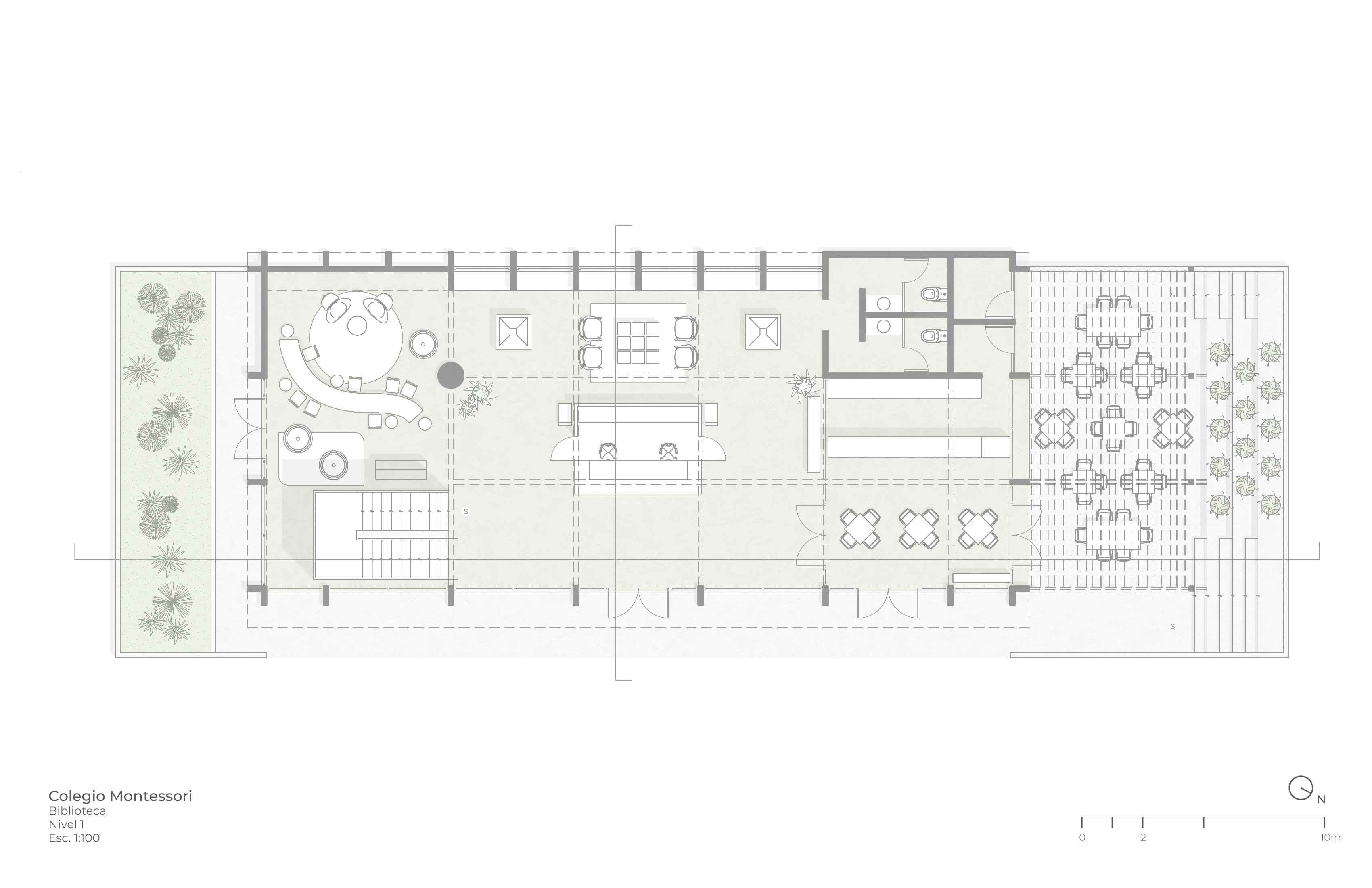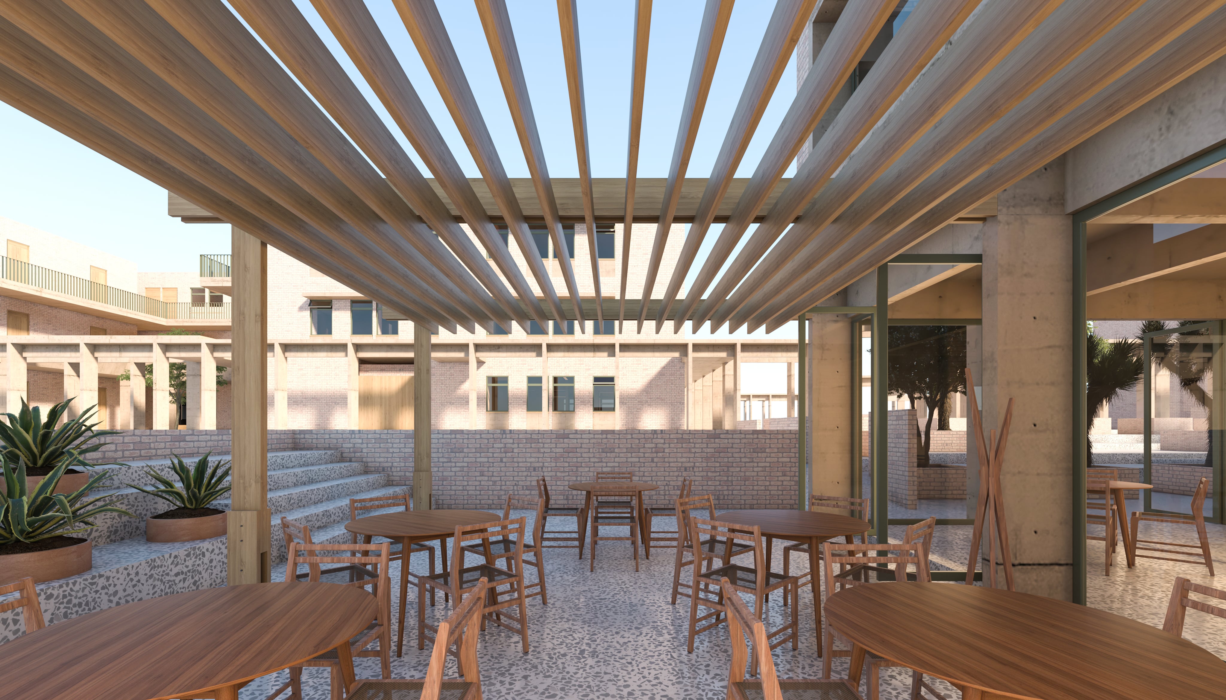 El proyecto de urbanización propone la creación de edificios para una escuela y un club deportivo, separados por un circuito de distribución que fragmenta los predios según el uso de suelo. Un gran jardín y una cancha de Fútbol 7 en el centro crean la ilusión de un parque continuo. La escuela Montessori se diseñó con un enfoque modular y progresivo, permitiendo su construcción por etapas. La retícula de 9x9 metros y pasillos de dos metros entre huellas facilita la expansión y la creación de espacios versátiles. La Biblioteca se ubica al poniente y se conecta con un huerto. La permeabilidad modular refleja la idea de 'Libertad con límites' de Montessori. La materialidad busca integrarse al contexto árido de la región con elementos de concreto, ladrillo beige y terrazo. Para el club deportivo, se busca una presencia contundente con naves basilicales para la alberca y la arena. El edificio sigue el mismo lenguaje material que la escuela, con una estructura modular de concreto aparente. Las áreas abiertas rodean las naves, incluyendo canchas de pádel, tenis, Fútbol 7, alberca social y cafetería. La materialidad incluye concreto aparente, ladrillo beige y terrazo pulido.