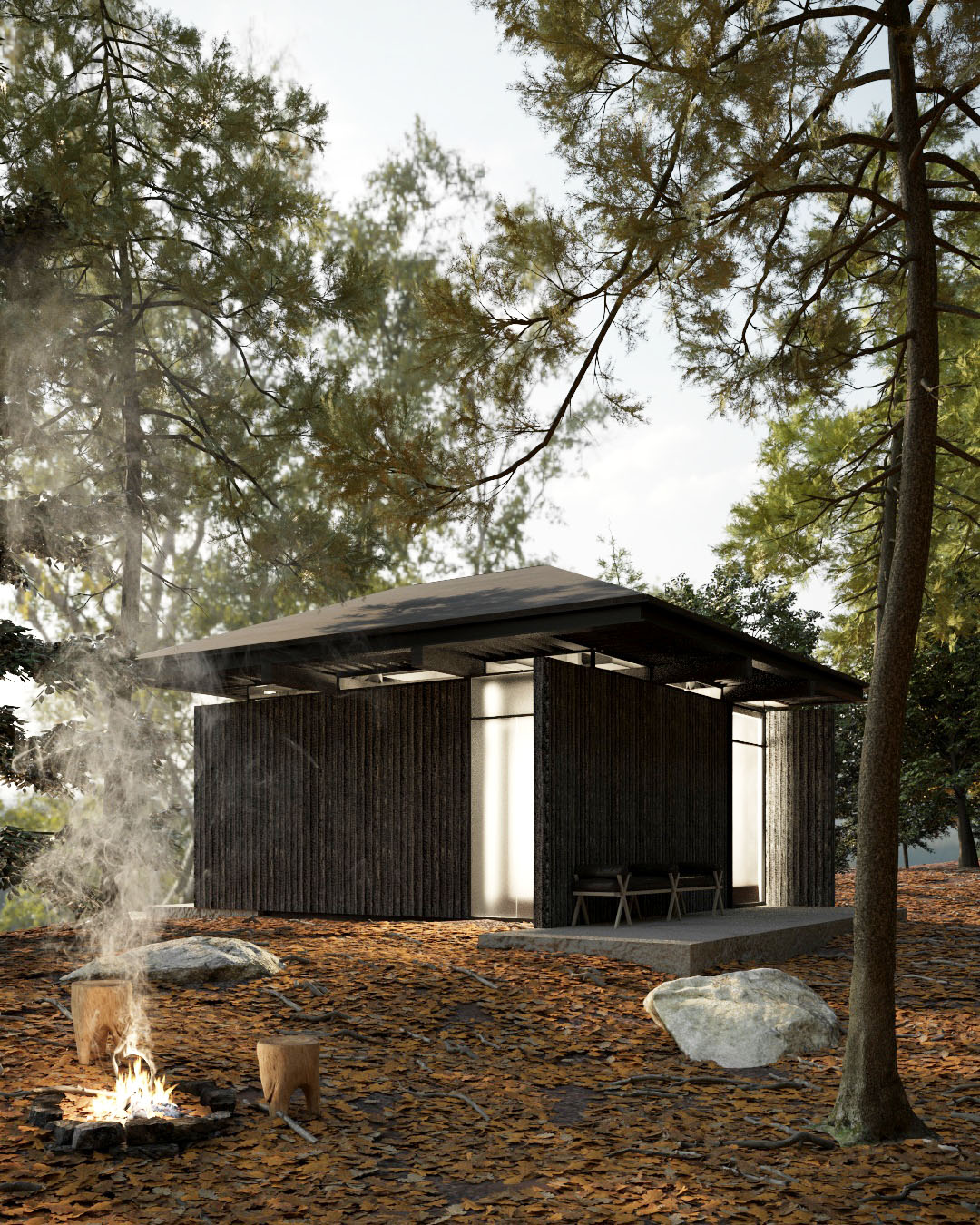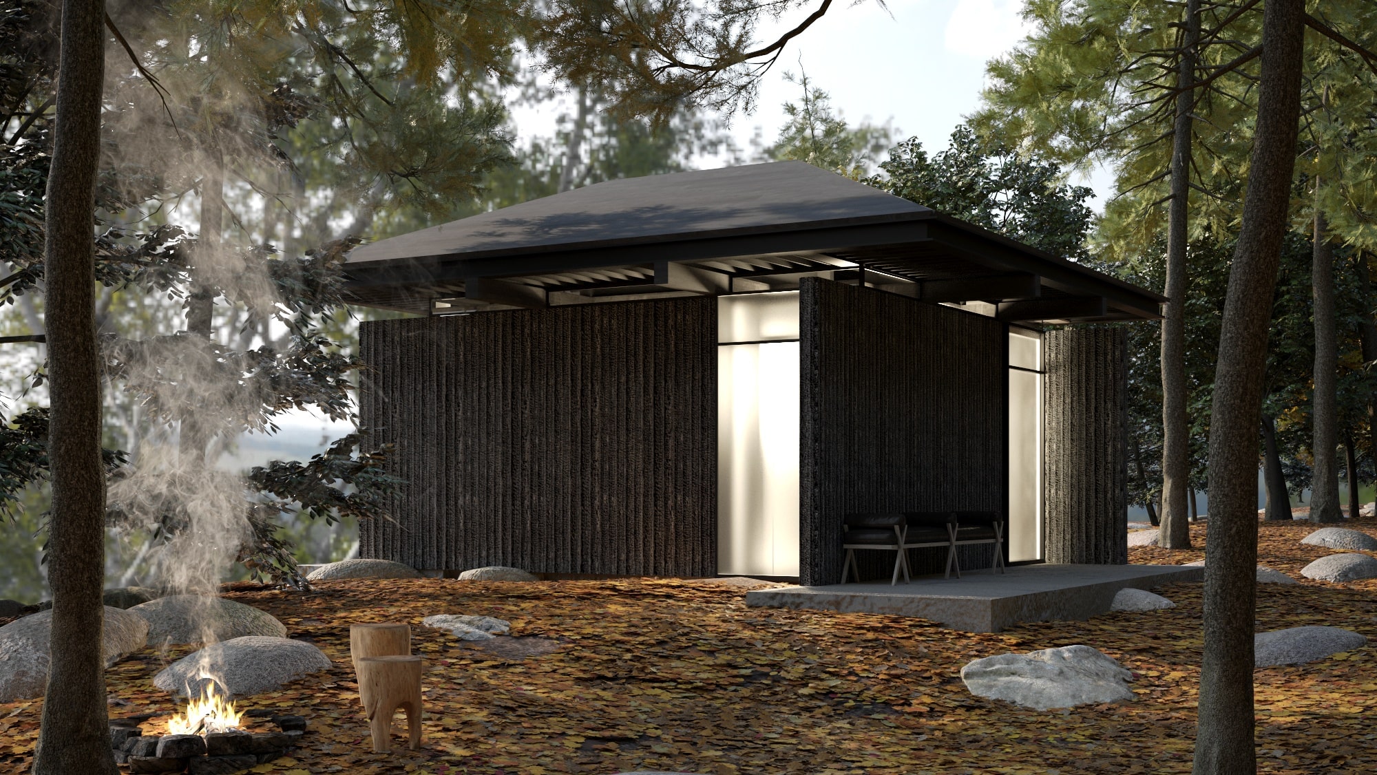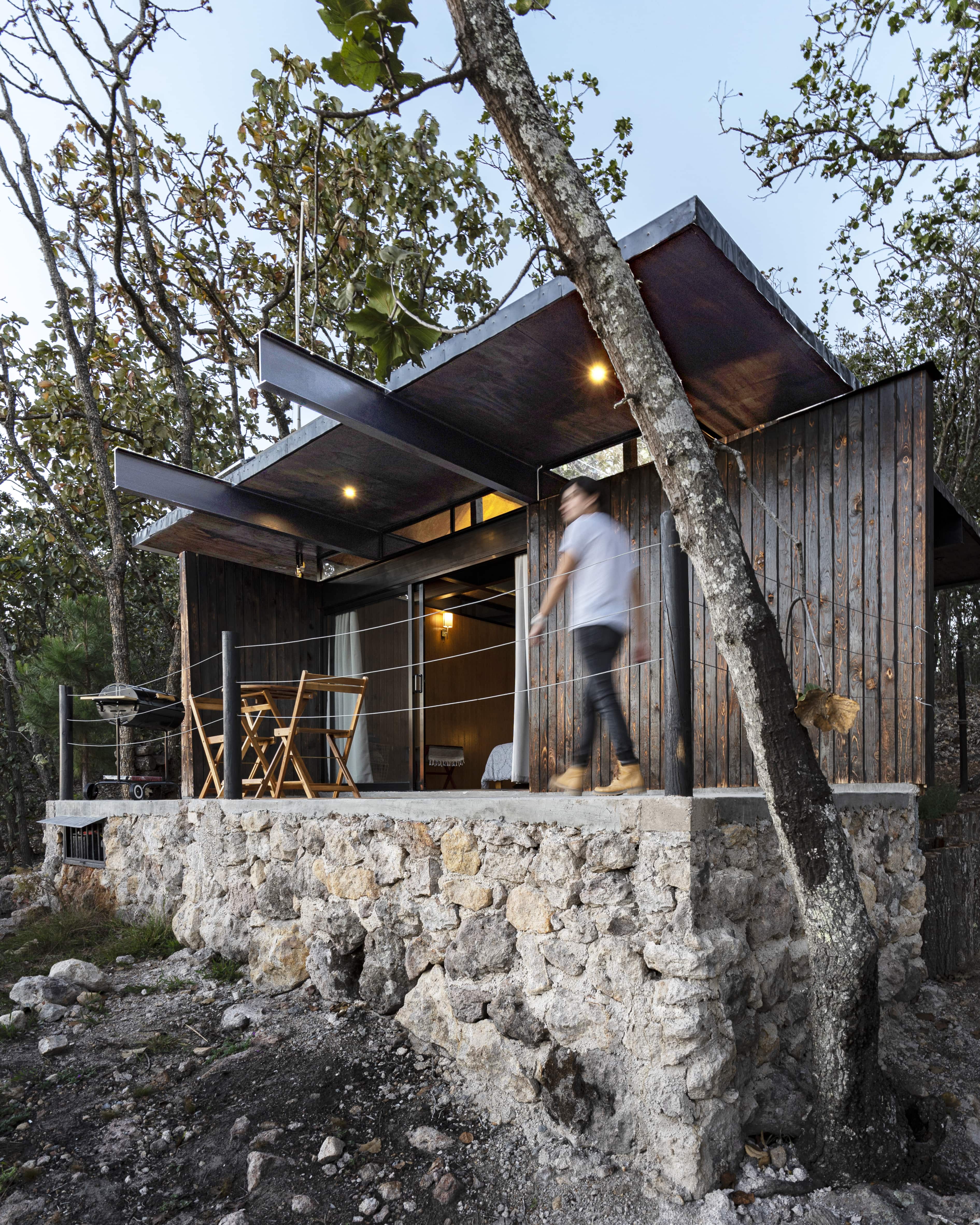 La cabaña está diseñada para ofrecer una experiencia cómoda en el campo sin perder el confort. Consta de una pequeña habitación con una cama, un baño completo y una terraza, lo que permite disfrutar de una estancia en medio del bosque de San Nicolás. La estructura está construida de madera, tratada con la técnica shou sugi ban. Esta técnica tradicional japonesa consiste en quemar la superficie de la madera para preservarla y darle un color oscuro característico. Este tratamiento no solo protege la madera de insectos y el clima, sino que también resalta su belleza natural. Para brindar una experiencia inmersiva de la noche estrellada en el campo, la cabaña cuenta con un domo de 2x2 metros en el techo, que permite a los huéspedes disfrutar de la vista del cielo estrellado desde la comodidad de su cama