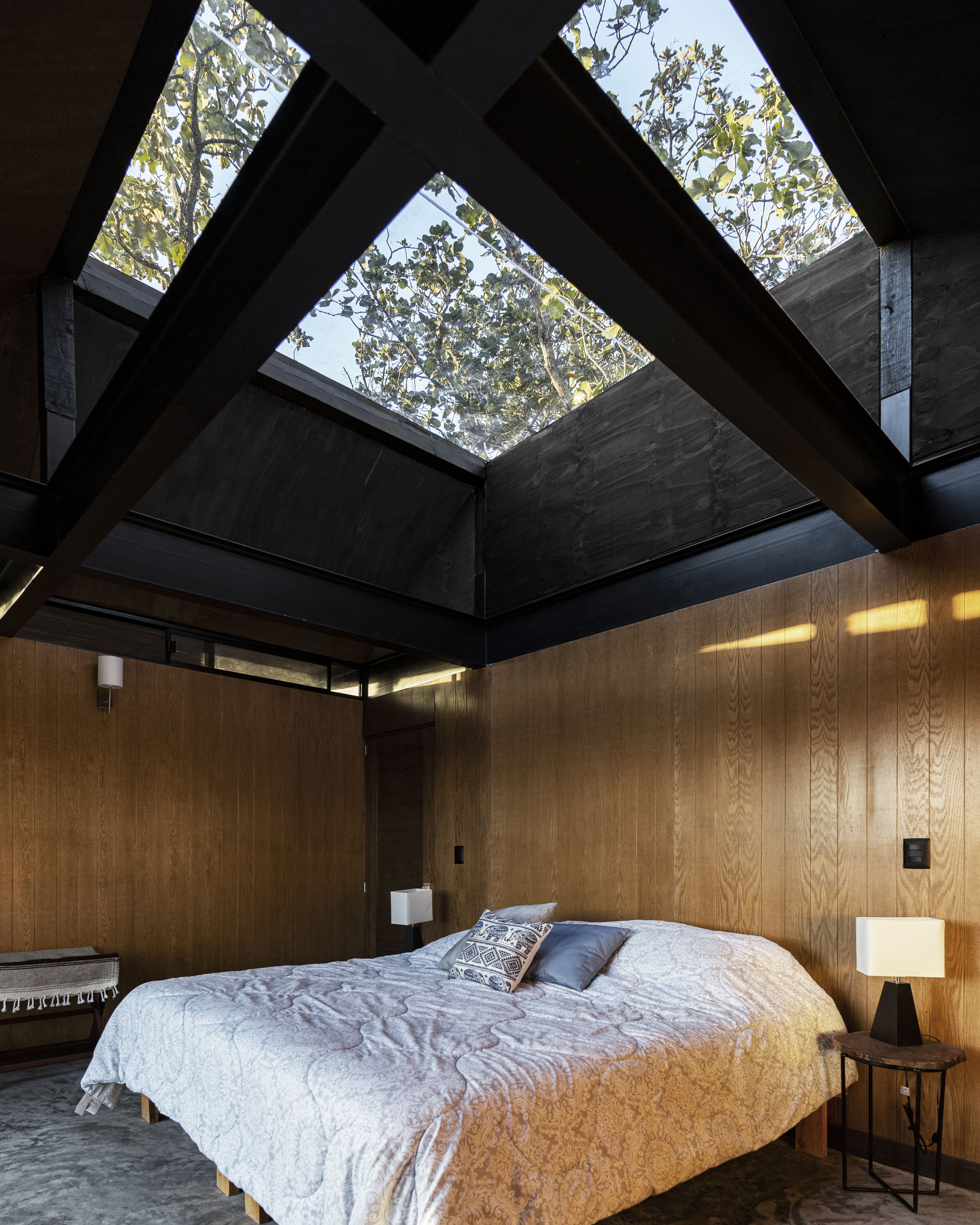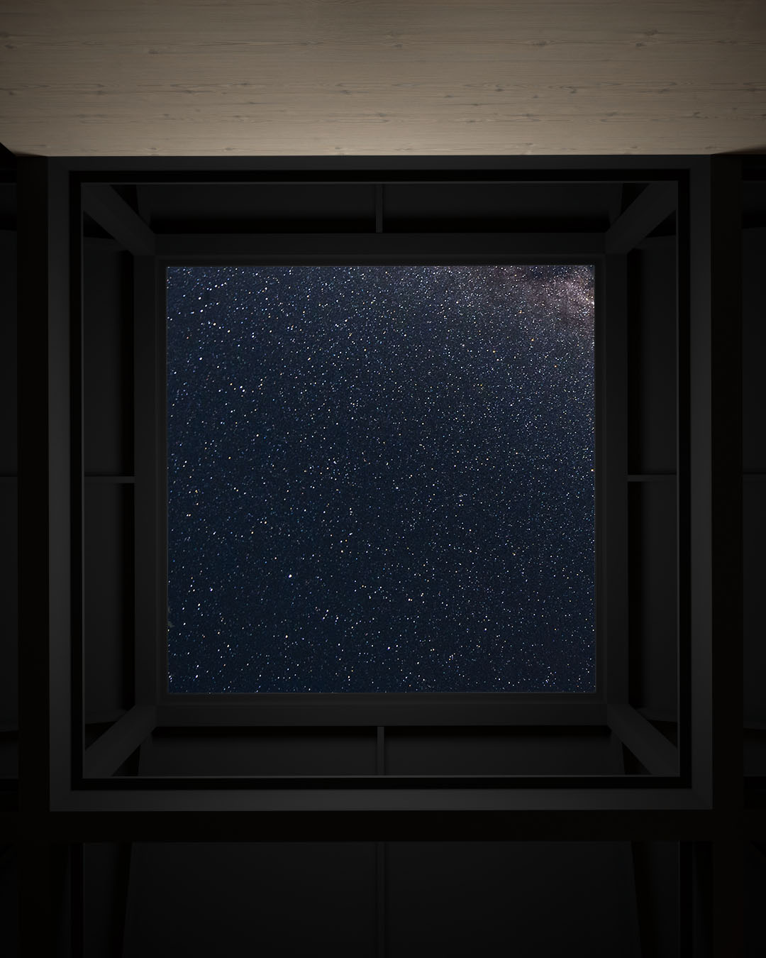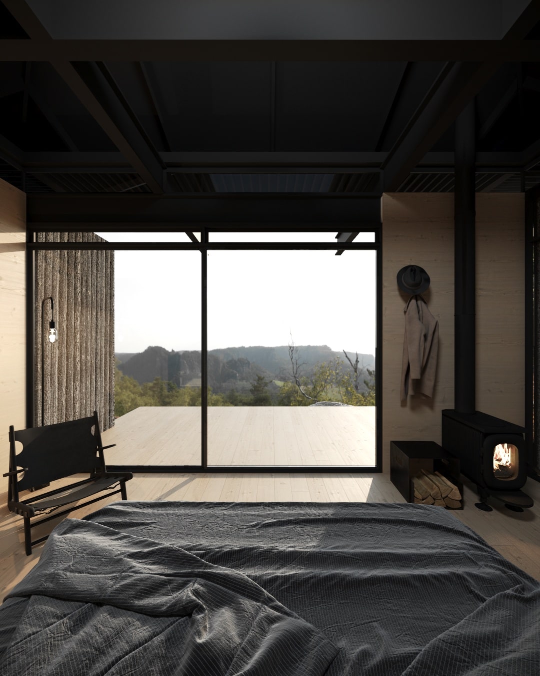 La cabaña está diseñada para ofrecer una experiencia cómoda en el campo sin perder el confort. Consta de una pequeña habitación con una cama, un baño completo y una terraza, lo que permite disfrutar de una estancia en medio del bosque de San Nicolás. La estructura está construida de madera, tratada con la técnica shou sugi ban. Esta técnica tradicional japonesa consiste en quemar la superficie de la madera para preservarla y darle un color oscuro característico. Este tratamiento no solo protege la madera de insectos y el clima, sino que también resalta su belleza natural. Para brindar una experiencia inmersiva de la noche estrellada en el campo, la cabaña cuenta con un domo de 2x2 metros en el techo, que permite a los huéspedes disfrutar de la vista del cielo estrellado desde la comodidad de su cama