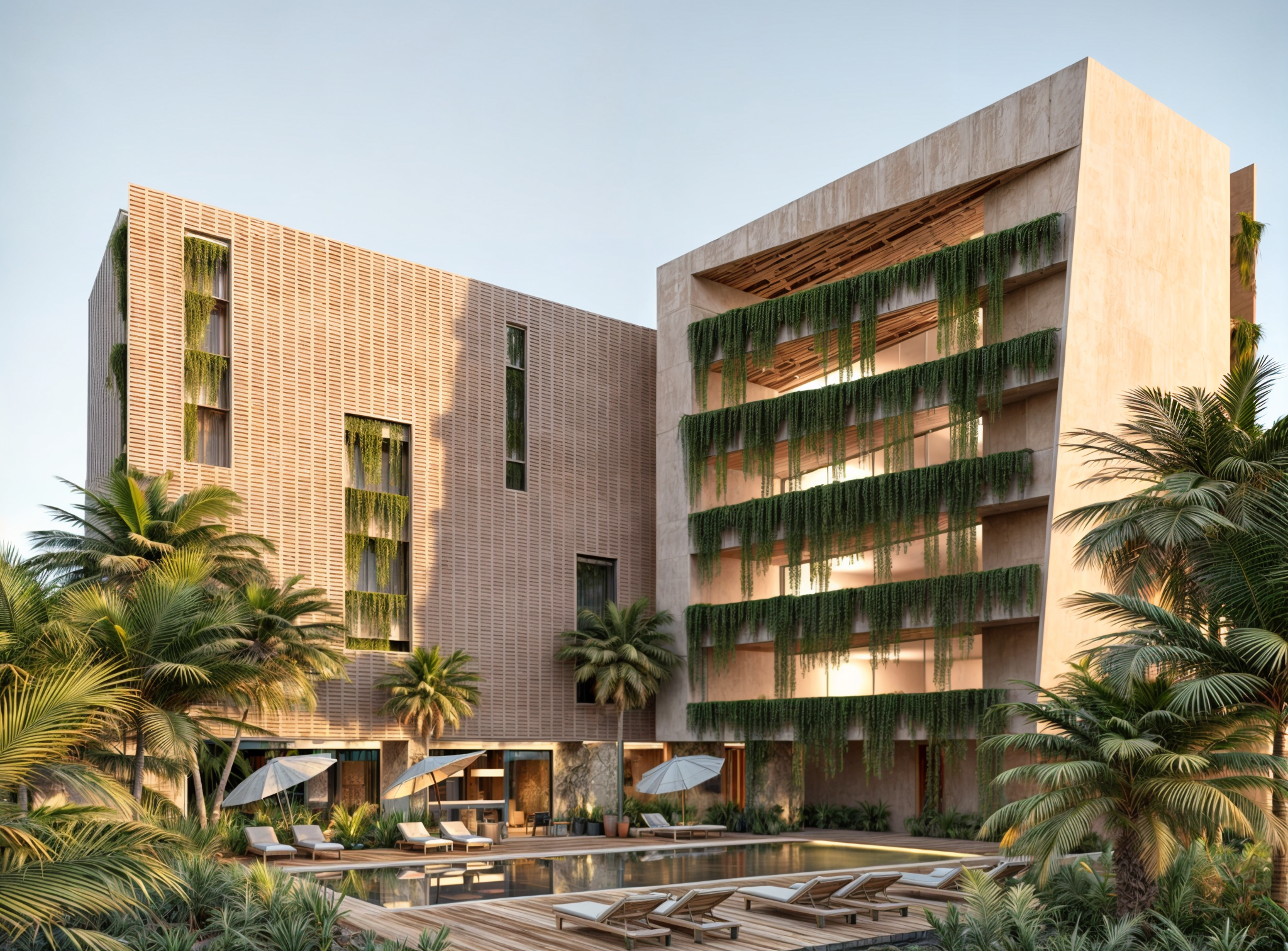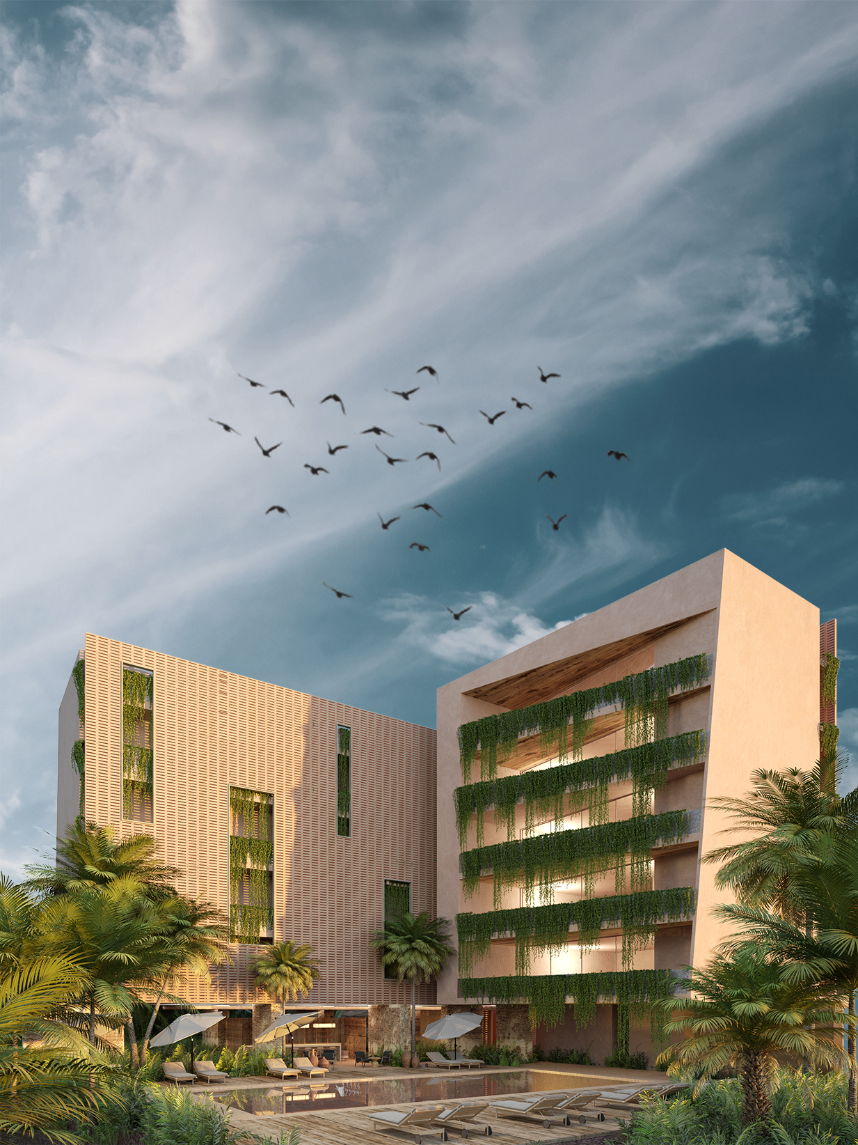El proyecto 'Macondo' se ubica en la exuberante selva de Tulum y busca crear una conexión armoniosa con su entorno natural. Con la premisa de preservar la naturaleza, este desarrollo se compone de pequeños departamentos destinados a albergar a 60 propietarios, integrando la arquitectura con el paisaje selvático. El diseño del proyecto prioriza la conservación del medio ambiente y la mínima alteración del entorno natural. En el primer nivel, se ha implementado una planta libre que alberga las áreas comunes, incluyendo piscinas, bares y zonas deportivas. Esta configuración abierta permite una circulación fluida y un uso flexible del espacio, fomentando la interacción social y el disfrute del entorno. Las estructuras están construidas con materiales locales y sostenibles, integrando elementos naturales en el diseño arquitectónico para mantener la estética y la funcionalidad en armonía con la selva. Grandes ventanales y balcones permiten a los residentes disfrutar de vistas panorámicas y de la ventilación cruzada, reduciendo así la necesidad de climatización artificial. El proyecto 'Macondo' no solo ofrece un refugio cómodo y moderno, sino que también promueve un estilo de vida en sintonía con la naturaleza. Los espacios comunes, diseñados para el ocio y el bienestar, invitan a los residentes a disfrutar de la serenidad y la belleza del entorno selvático, creando una comunidad sostenible y consciente del medio ambiente en el corazón de Tulum